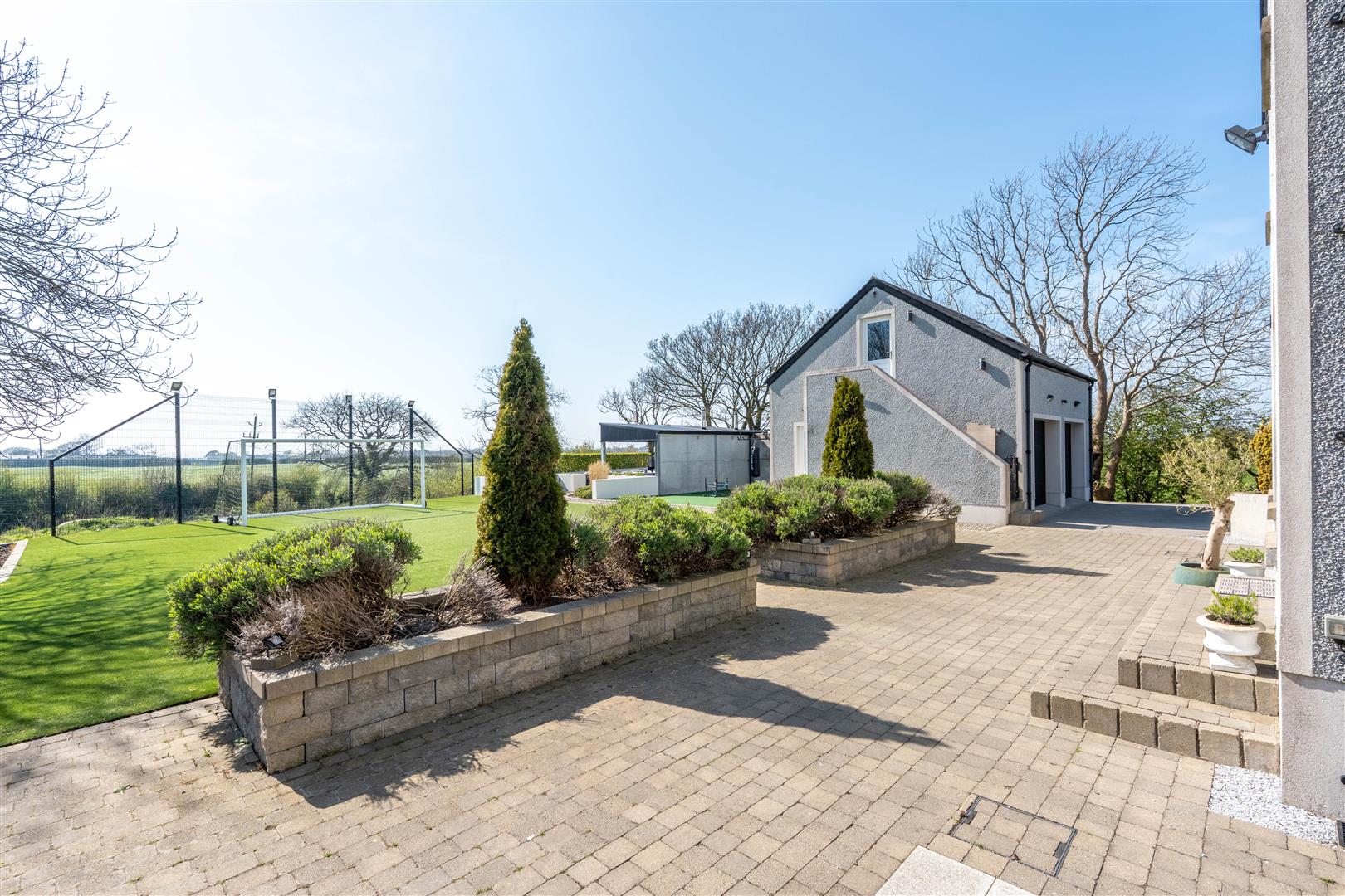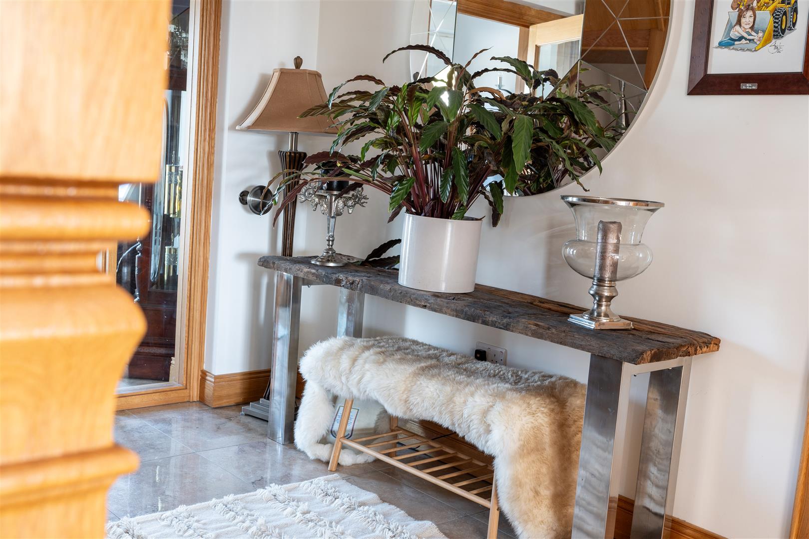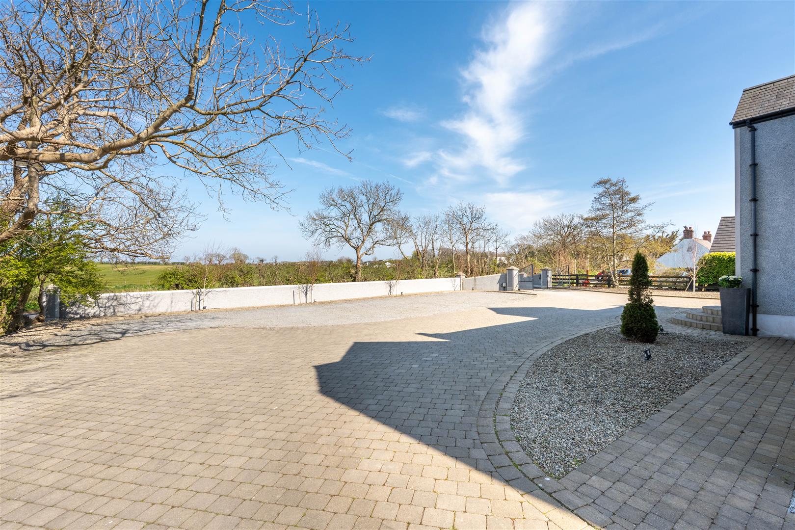 Approached through wrought iron gates, the property benefits from a substantial brick-paviour parking area with granite-stoned features, providing extensive space for cars, caravan, boat and more. The grounds are framed by mature Ash, Silver Birch and Alder trees.