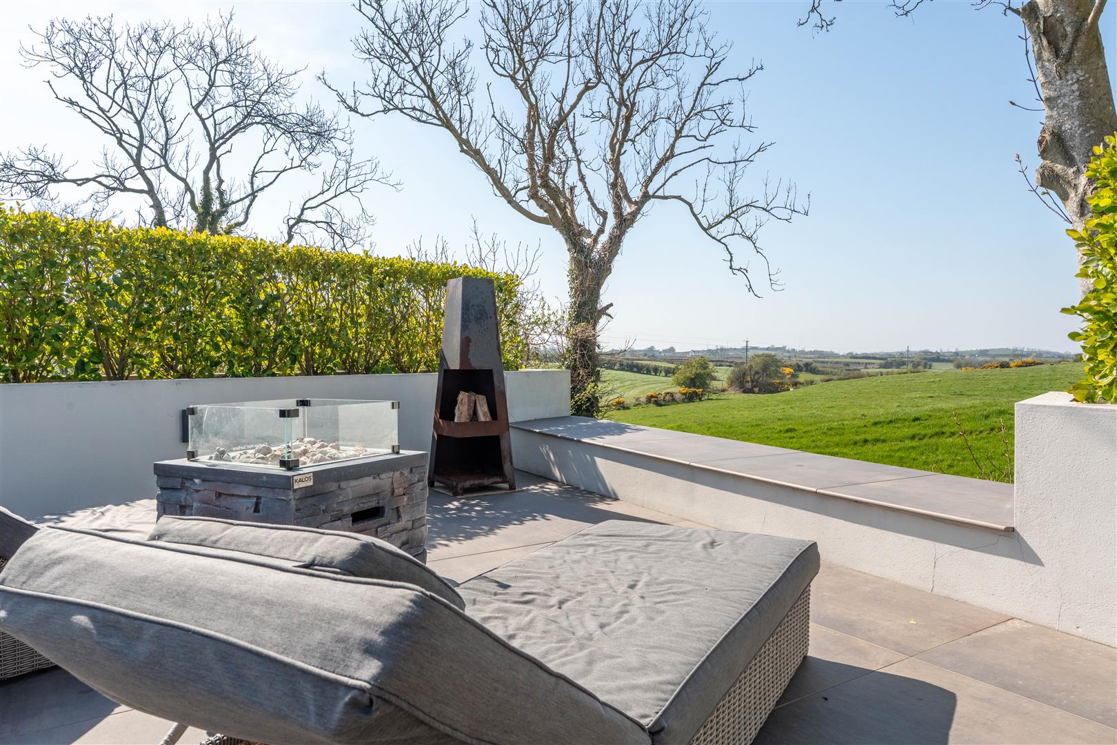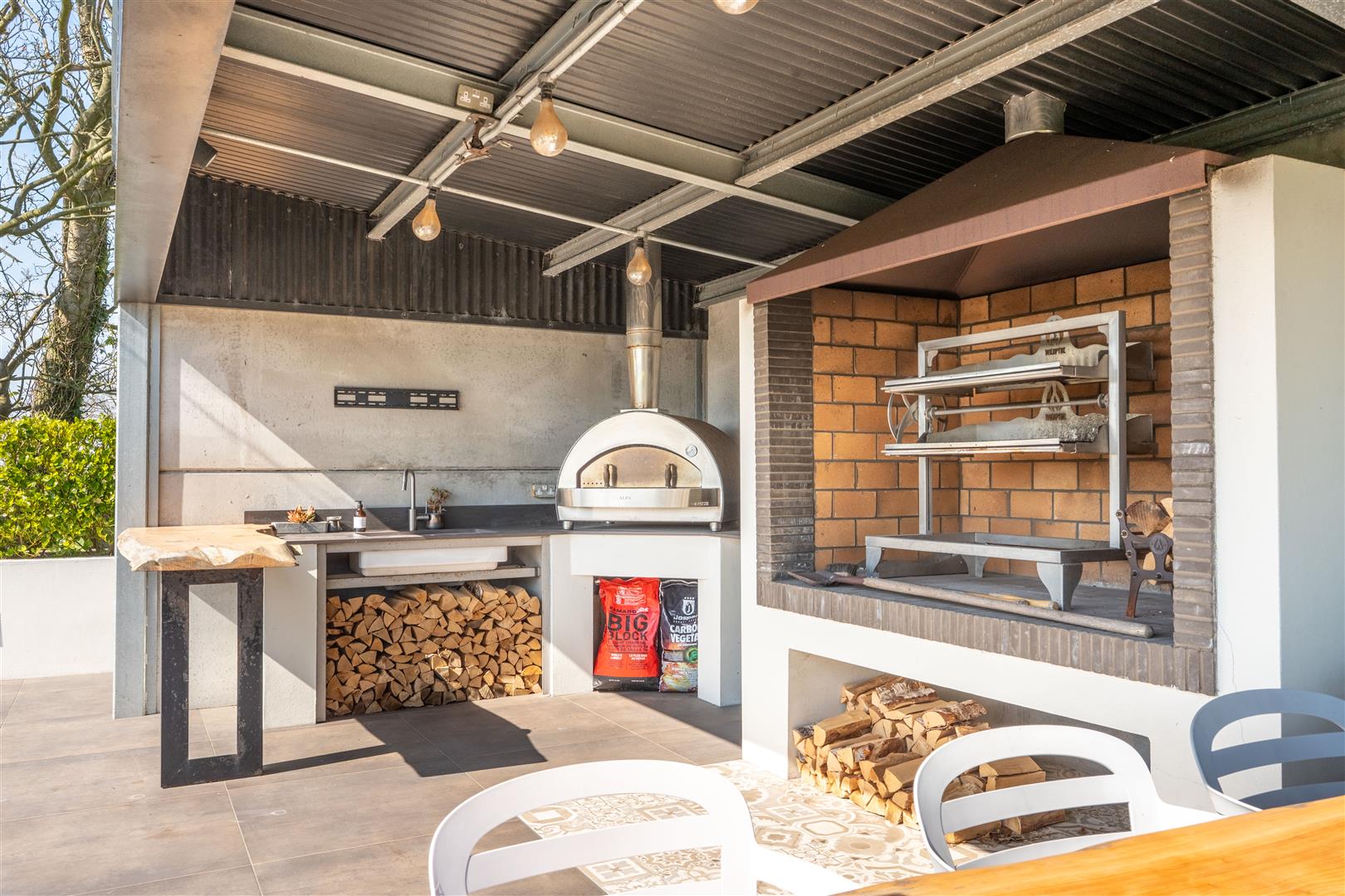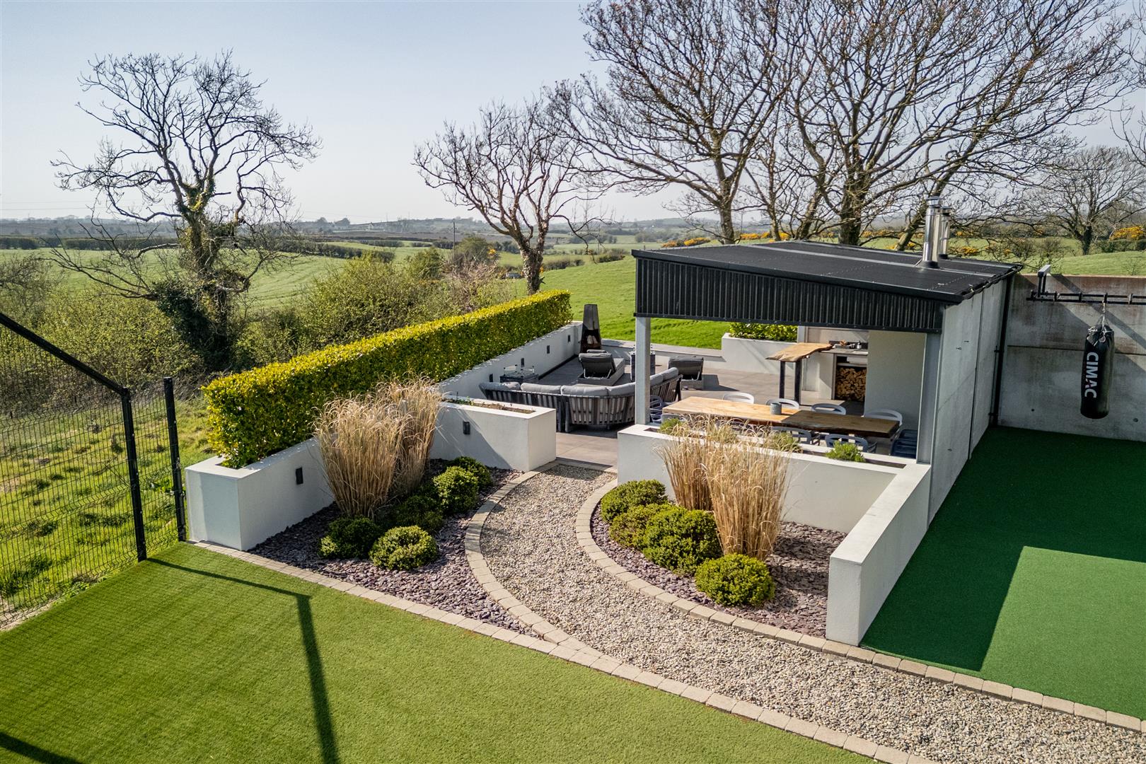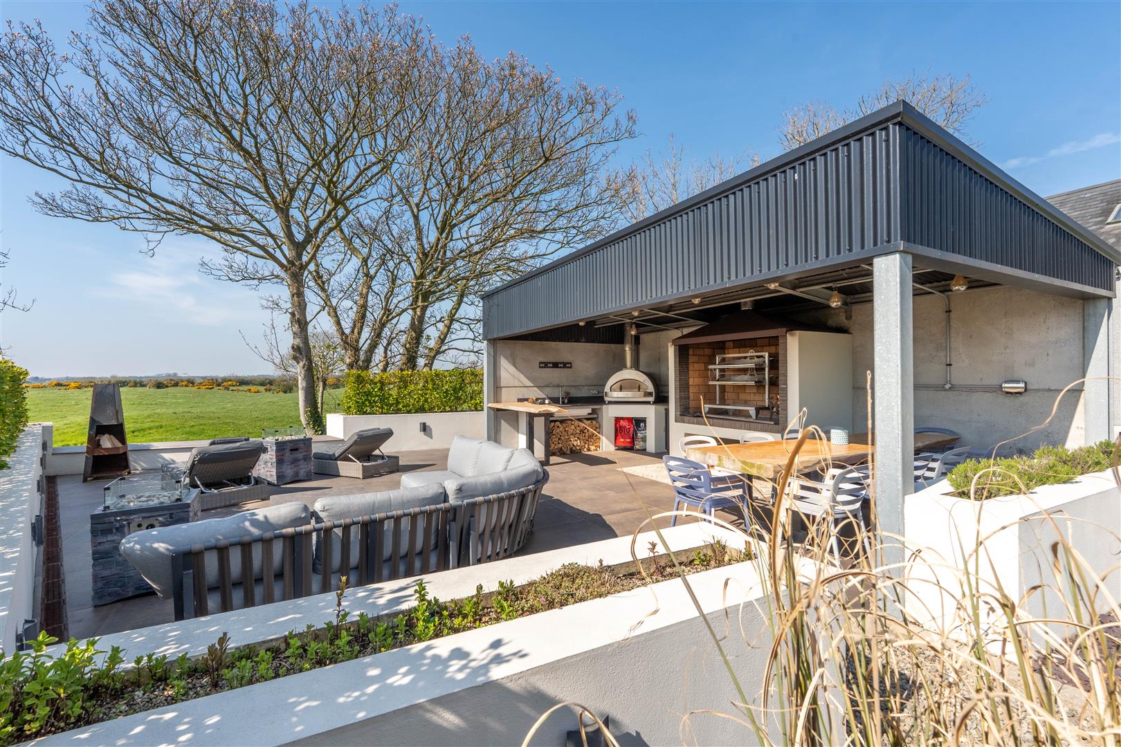 Double Belfast sink with mixer taps set on Dekton and timber worktop; Alfas wood fired pizza oven; space for grill / barbeque in fire brick surround with wood store below; porcelain tiled floor; raised lavender and herb flowerbeds; light and power.