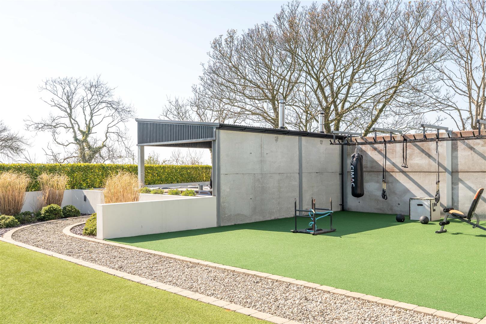The grounds are equally impressive. Approached by wrought iron gates, the property offers extensive brick-paviour parking framed by mature trees. A double garage sits to the side, currently used as a gym, with loft space above suitable for office use or further development, subject to approvals. The rear garden features generous patios with raised lavender beds, artificial grass for ease of maintenance, an outdoor gym, enclosed dog run and outside shower.