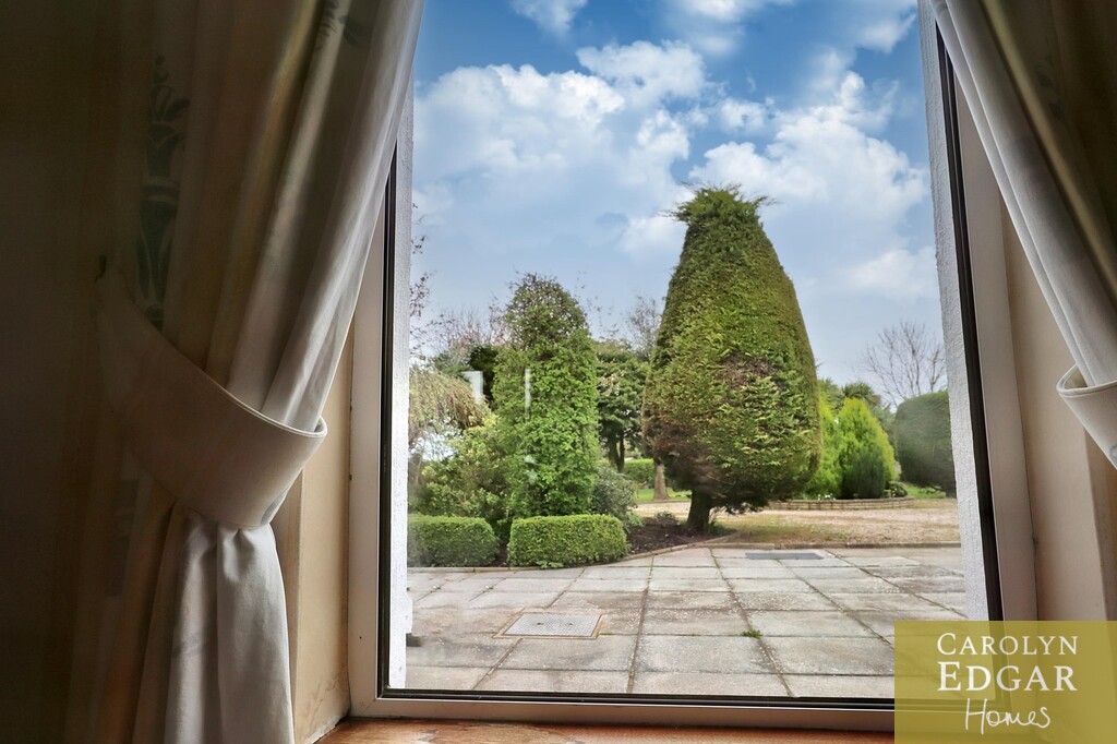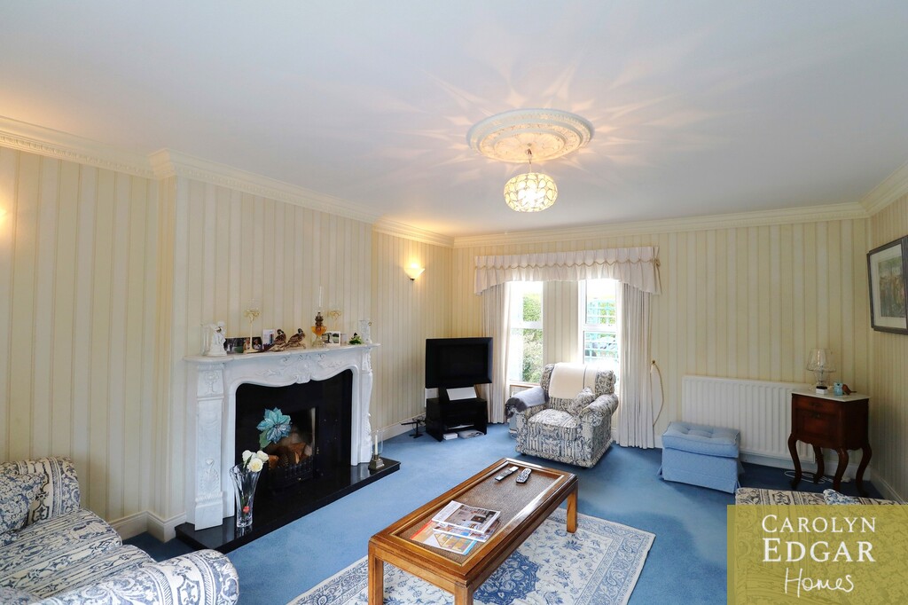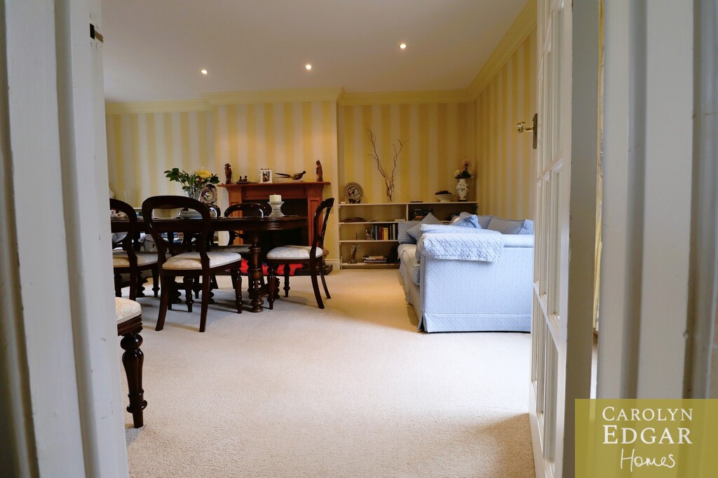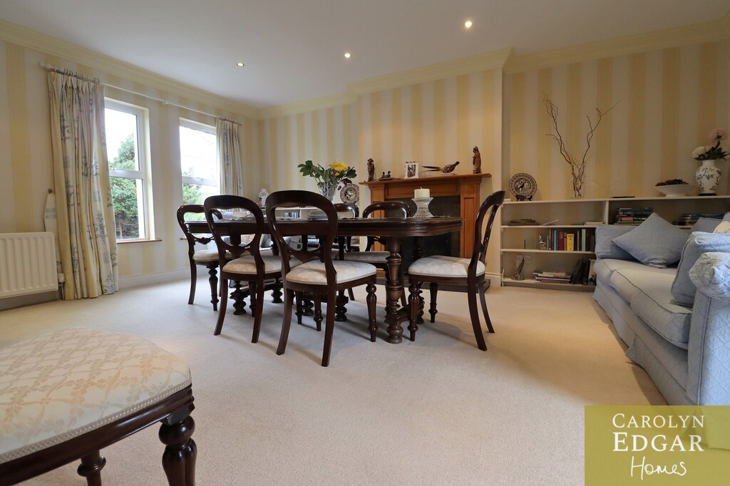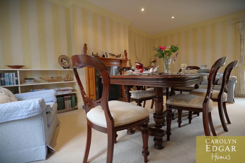 Formal Dining Room with Feature Fireplace and Dual Aspect Views Over Gardens
