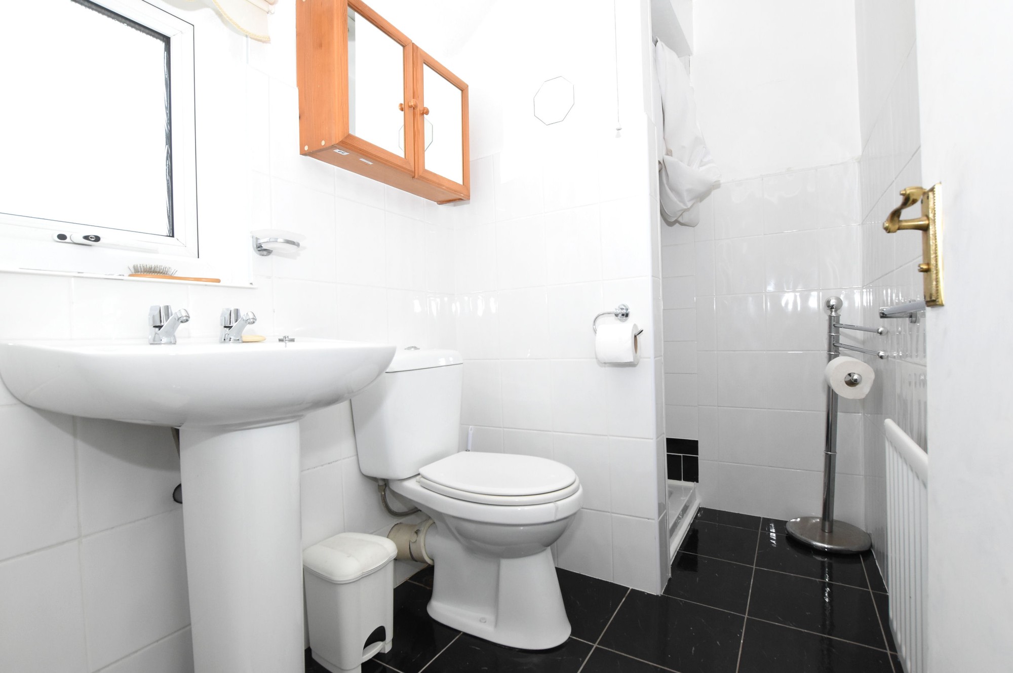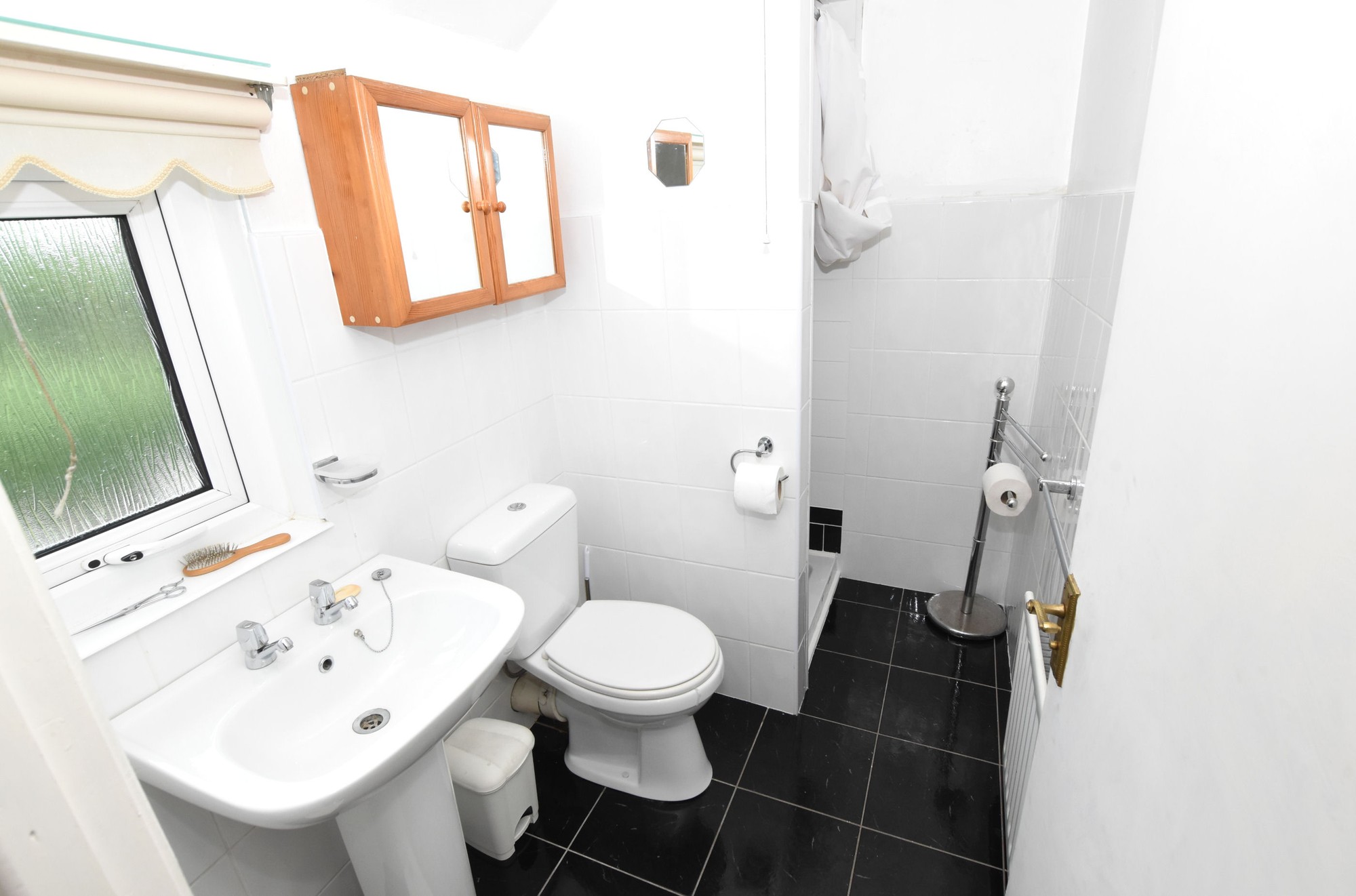 3 piece white suite comprising; pedestal wash hand basin, low flush WC, Shower cubicle with electric shower. Tiled flooring; part tiled walls, single panel radiator.