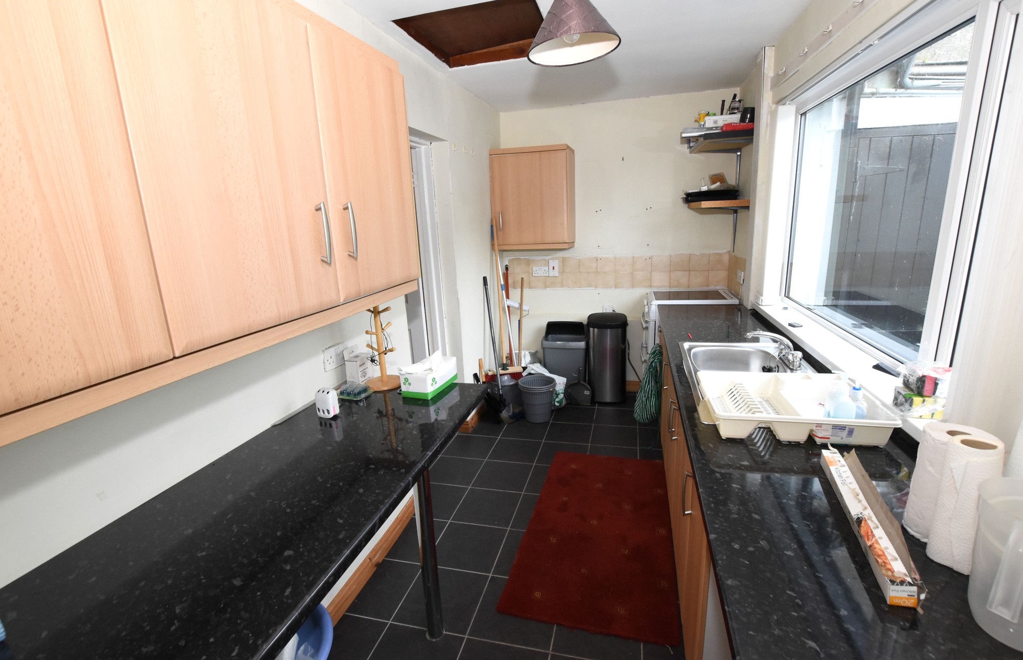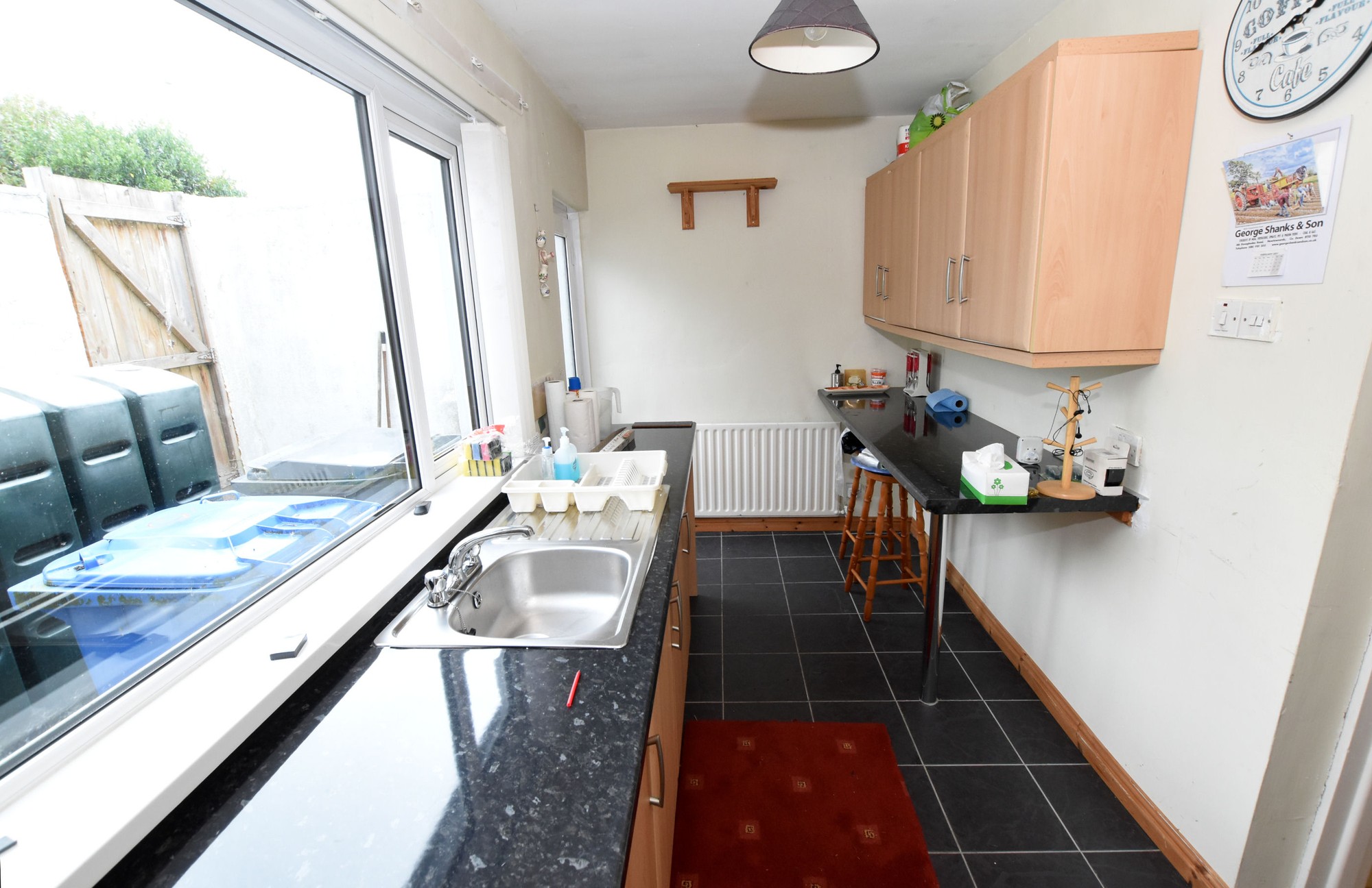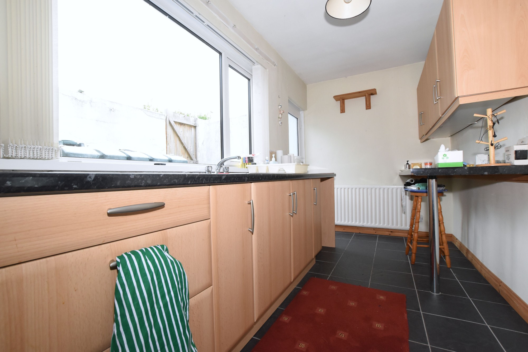 Range of high and low level Beach effect units with marble effect roll edge worktops. Single drainer stainless steel sink unit with mixer taps. Plumbed for Washing Machine. Built in Breakfast bar. Tiled flooring, single panel radiator.