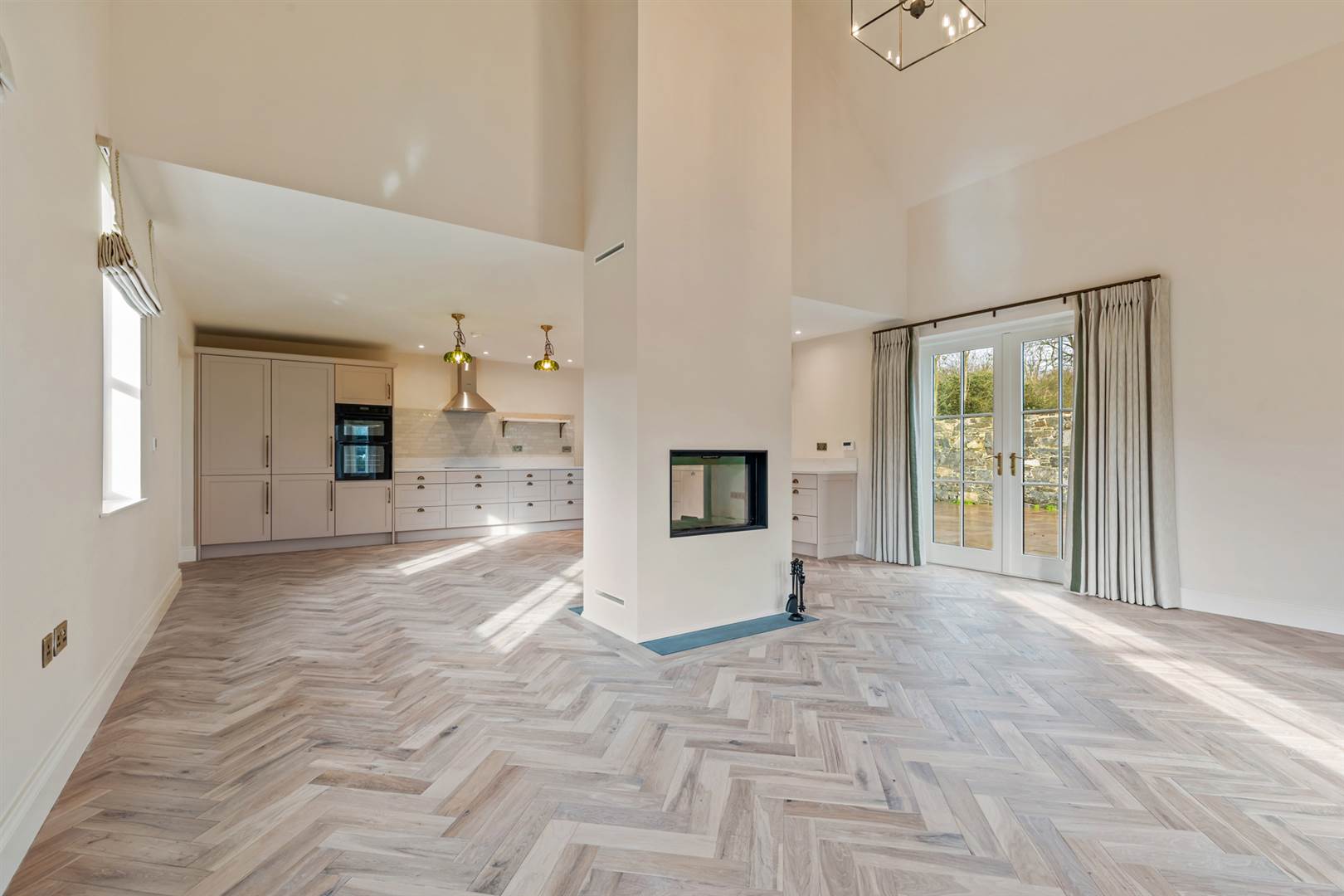 Large open plan kitchen / living / dining space with central double-sided fireplace