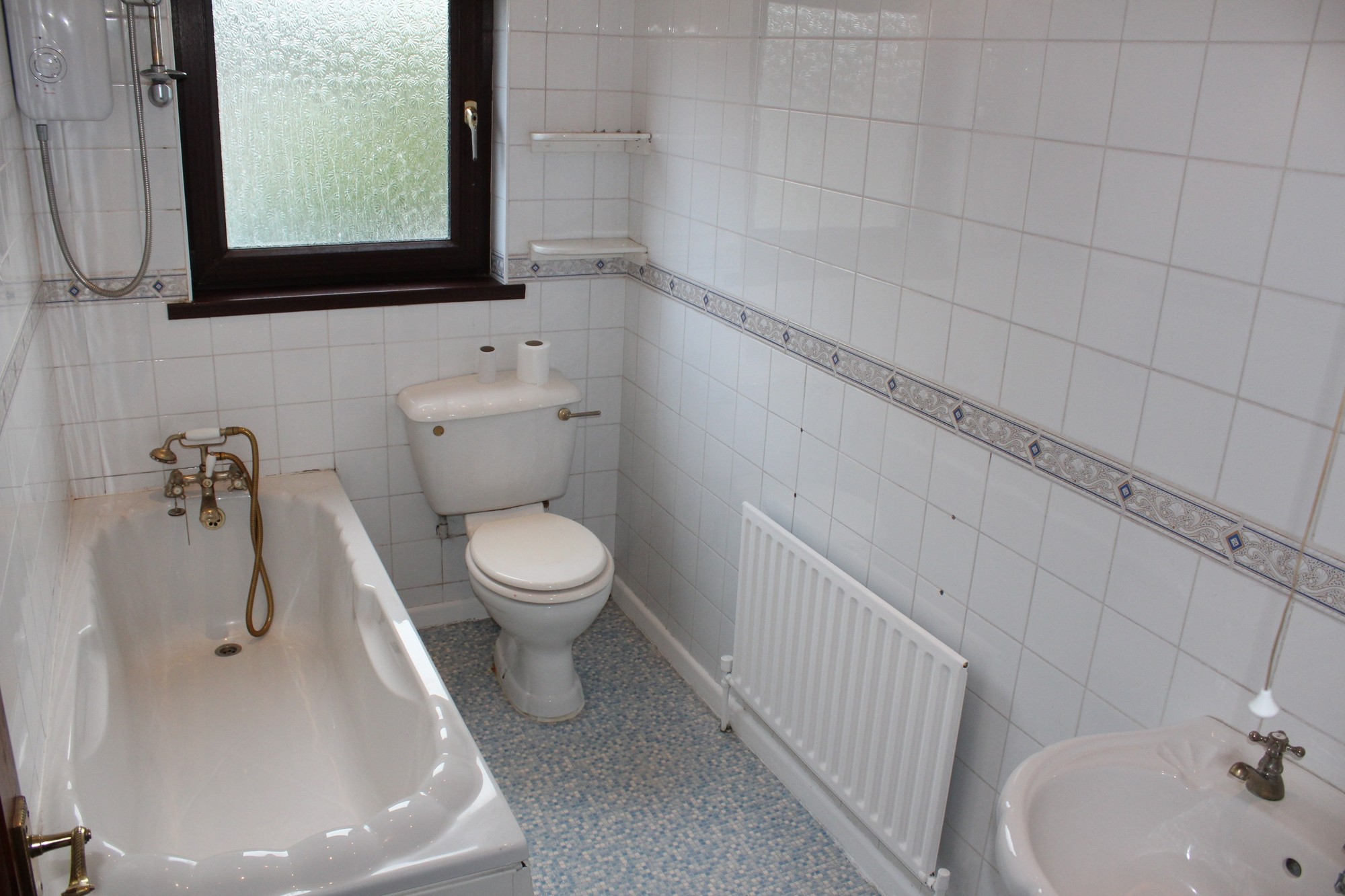 Three piece bathroom suite consisting of a w/c, sink and bath with an electric shower unit.