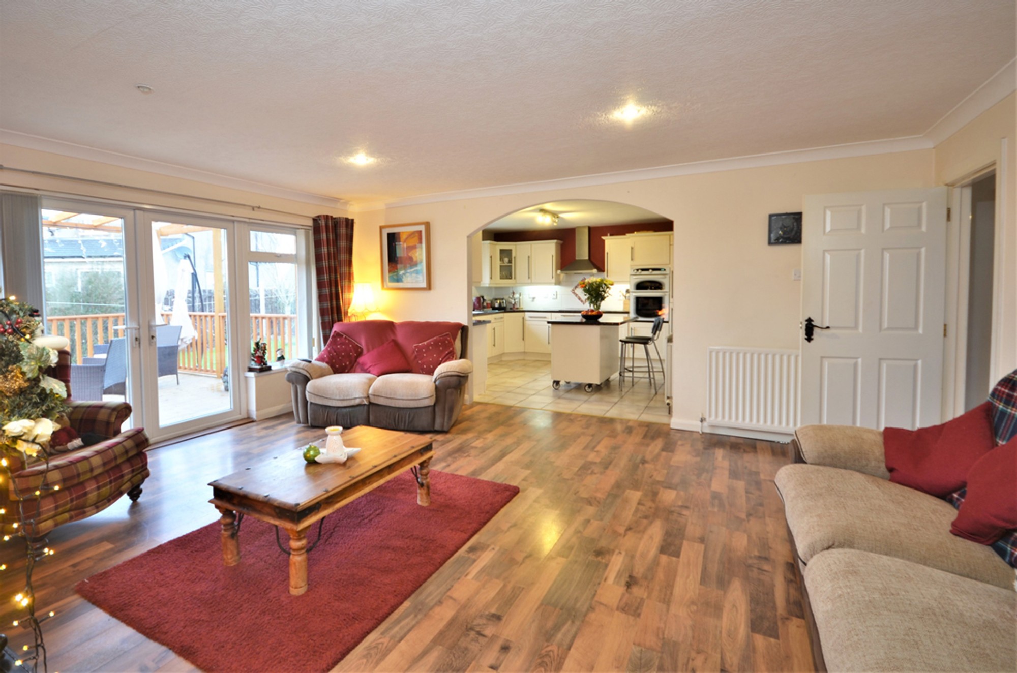 Spacious living room open to modern kitchen and double doors out onto covered deck area