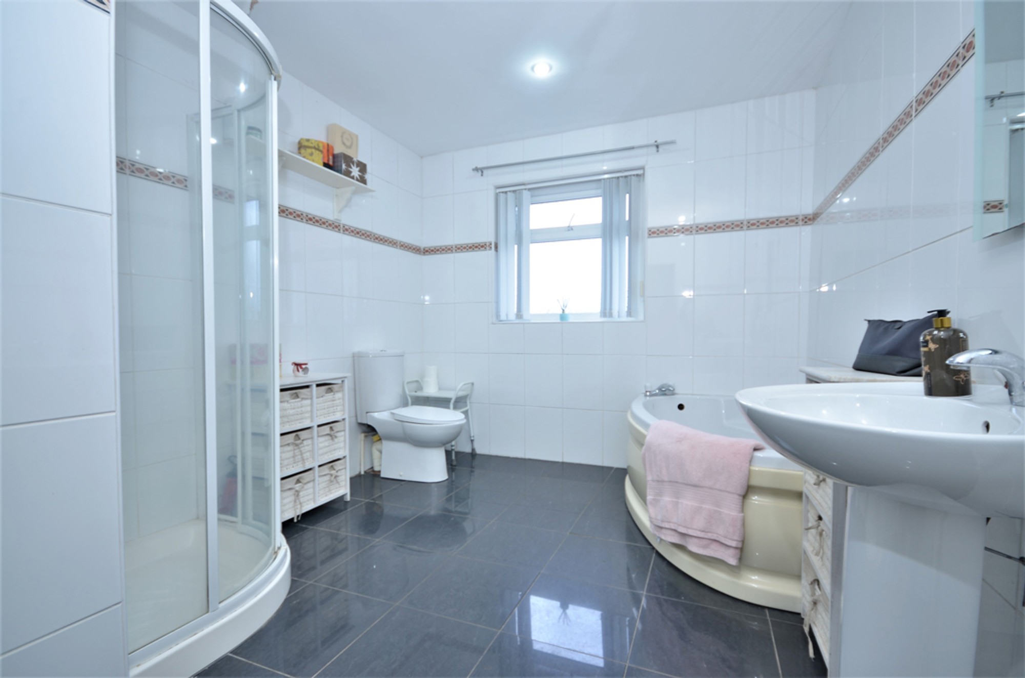 Corner bath, corner shower cubicle, wash hand basin, W.C., tiled floor and fully tiled walls, towel rail radiator and linen cupboard