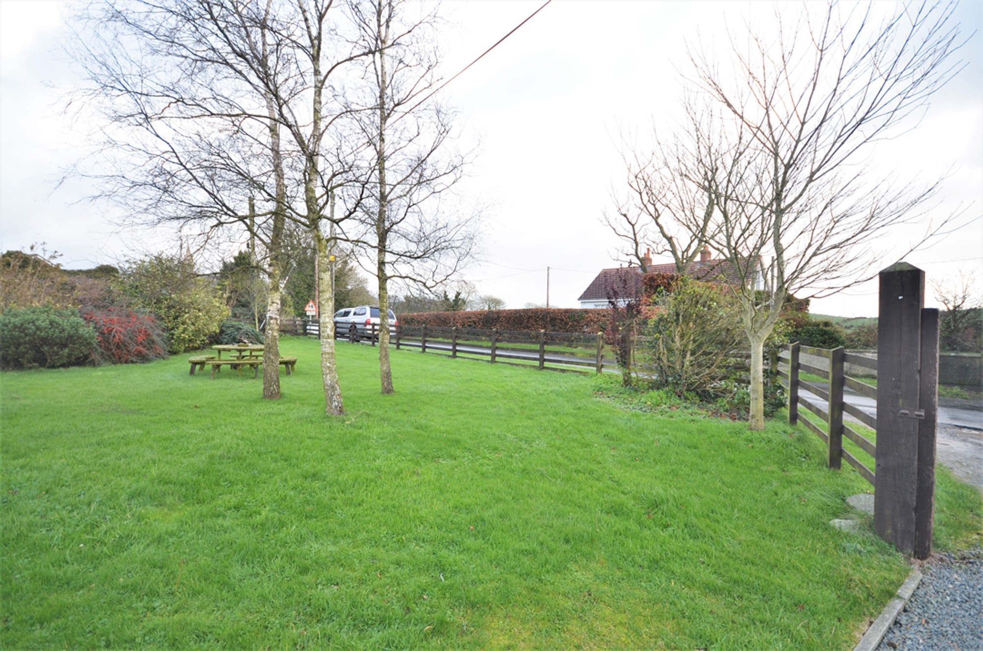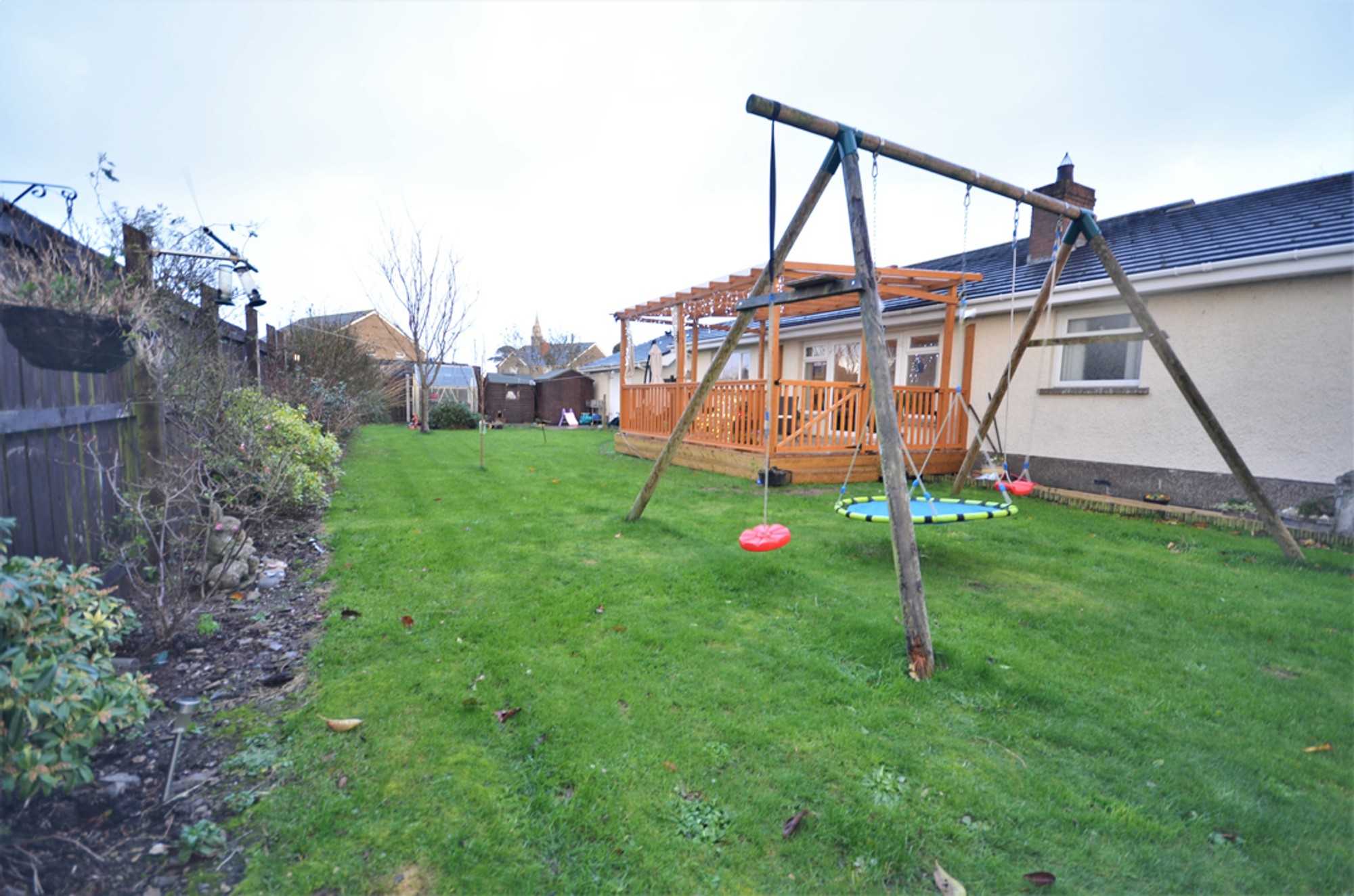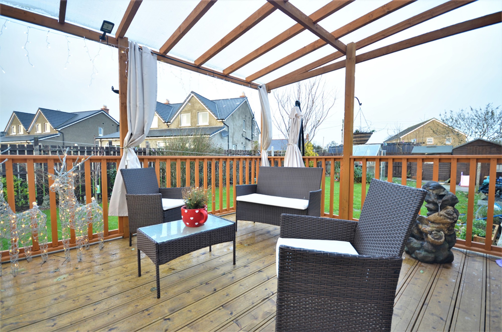 Covered deck area (5m x 4m). Rear garden in lawn, flower beds, raised beds and greenhouse.
