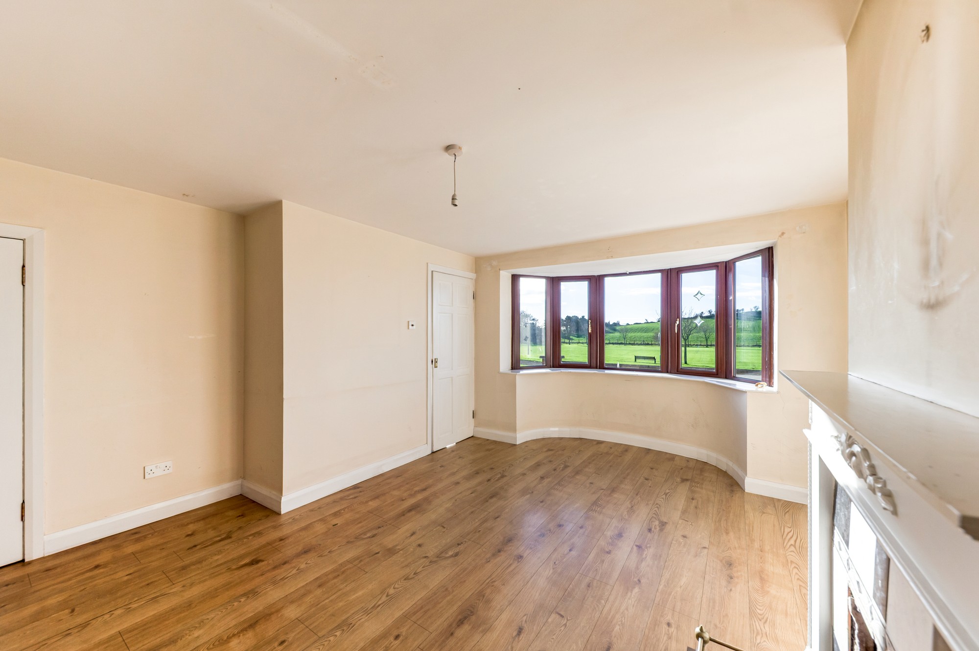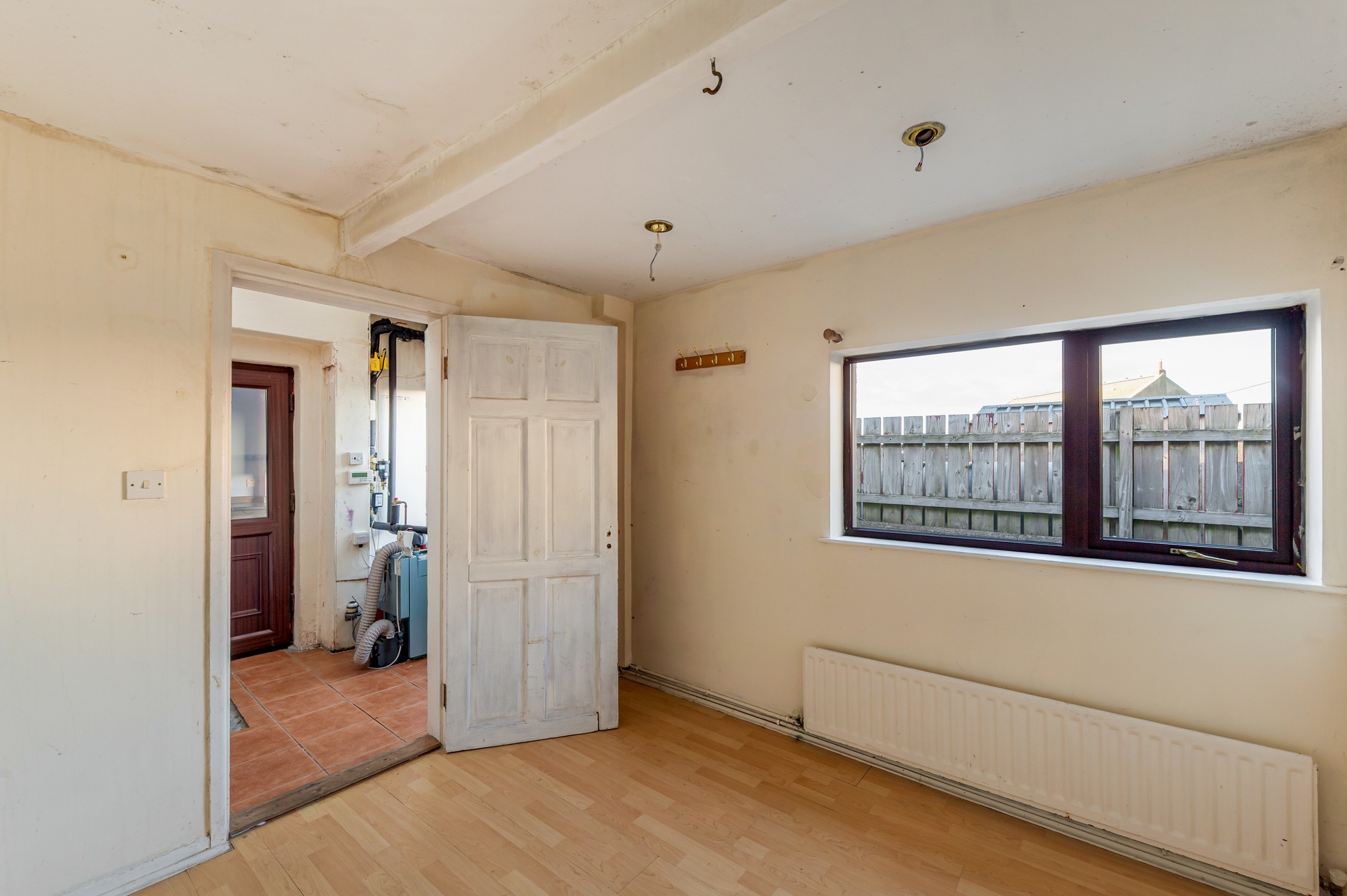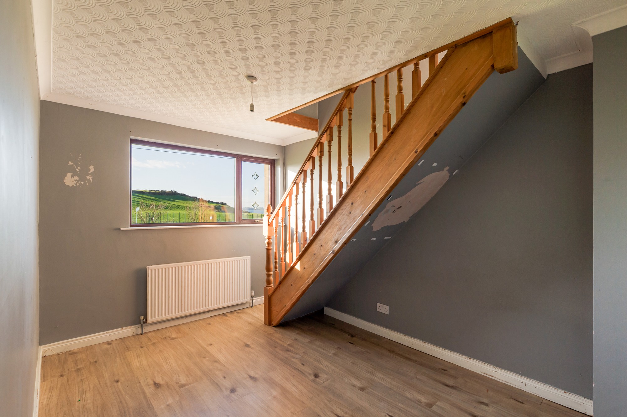 Spacious living area with a charming fireplace and a bay window offering stunning sea views. Finished with wooden laminate flooring and a pendant light, this room also benefits from a handy under-stair storage cupboard.