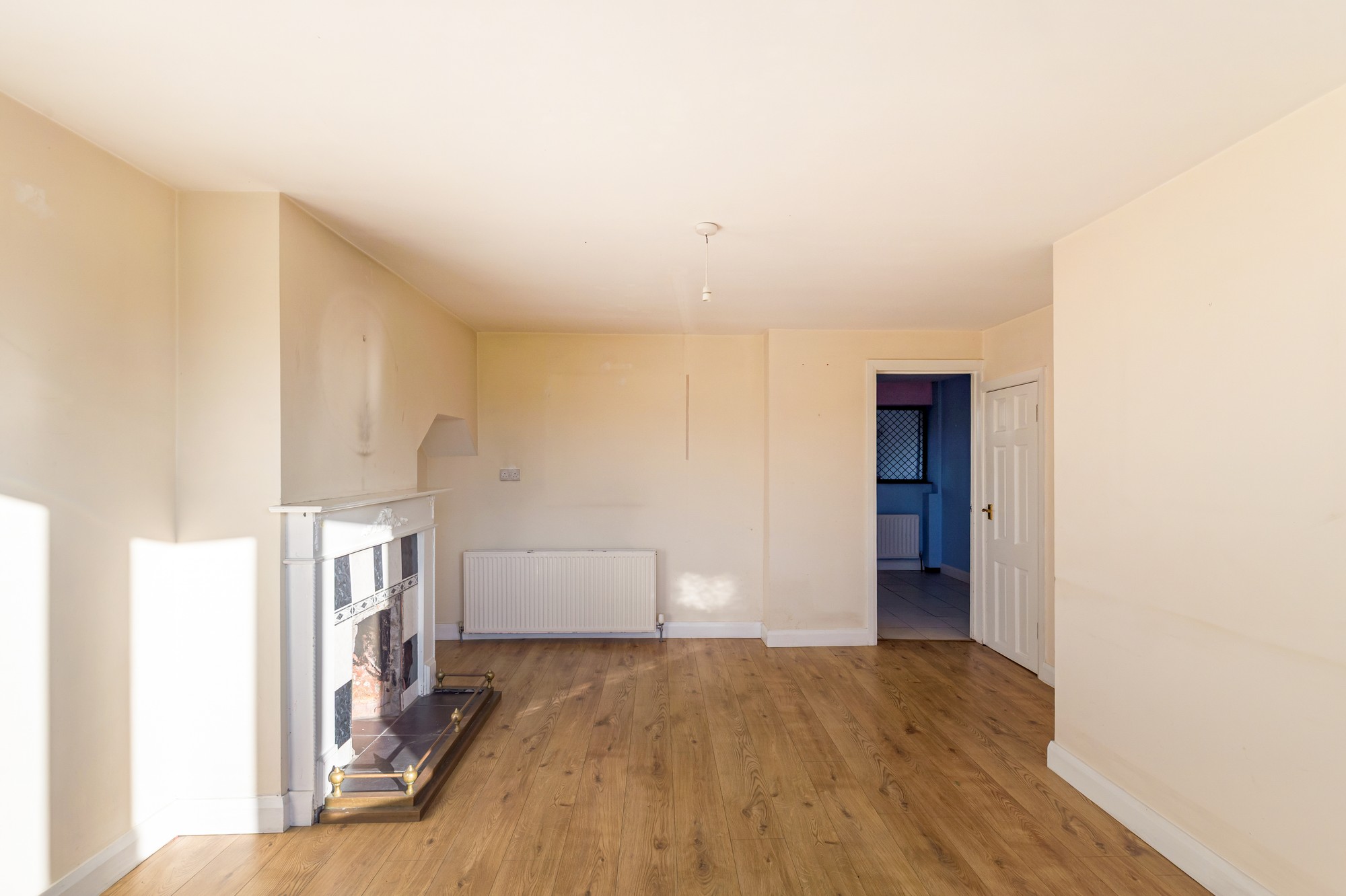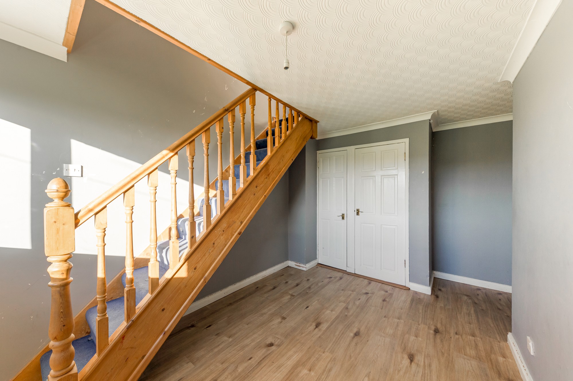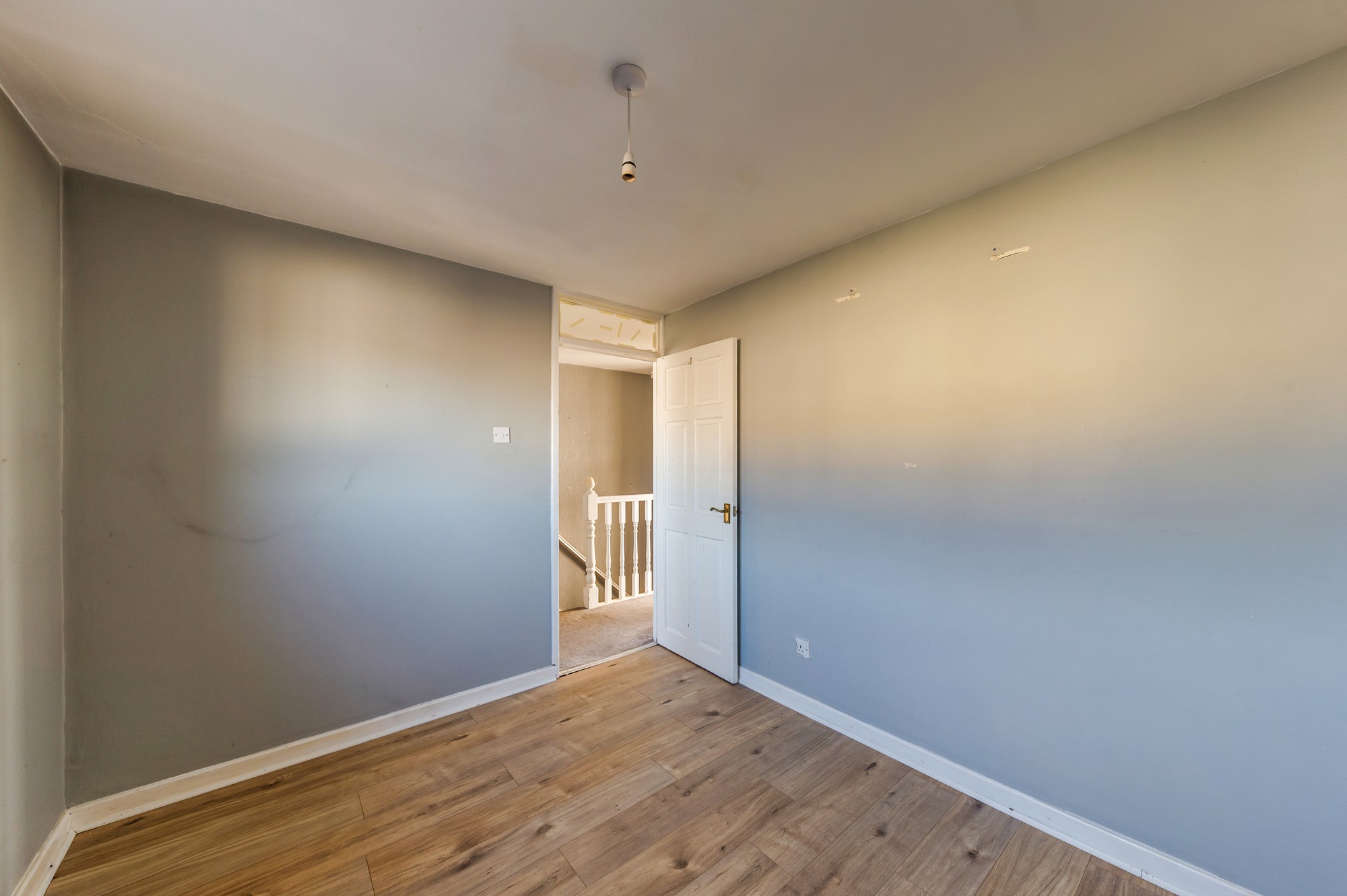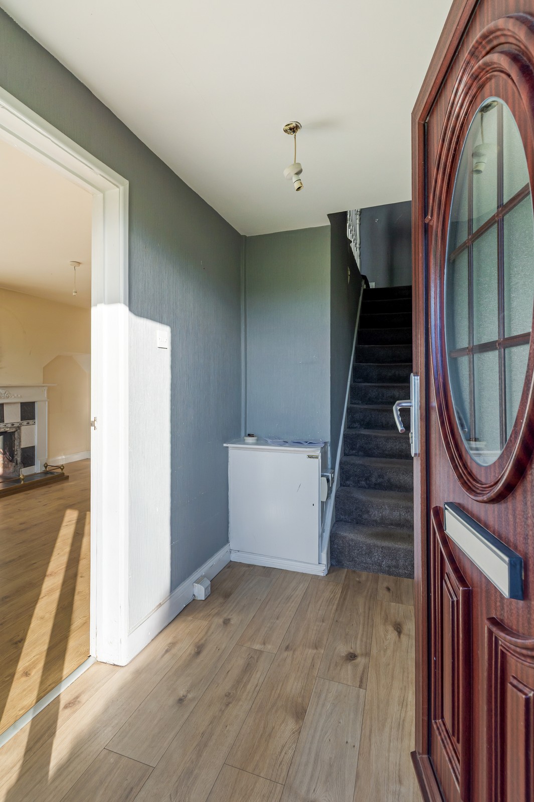 Welcoming entrance hallway featuring wooden laminate flooring and a pendant light, providing a bright introduction to the home.