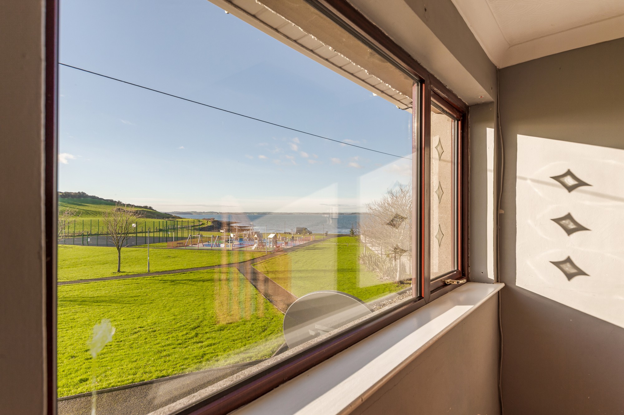 Generously sized bedroom with built-in wardrobe and sea views. Wooden laminate flooring and a pendant light. Stairs from this room lead to the playroom or a potential fourth bedroom.
