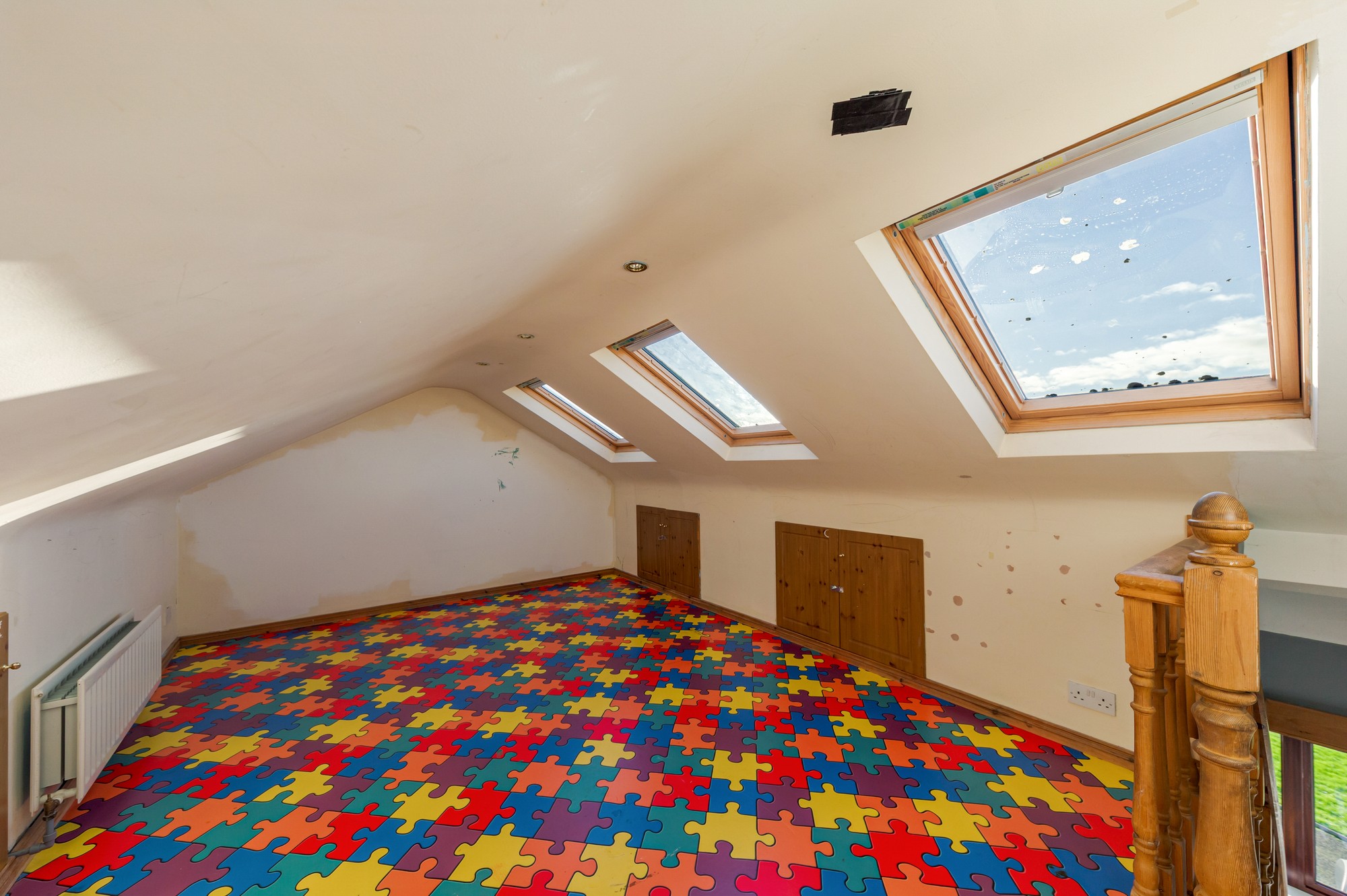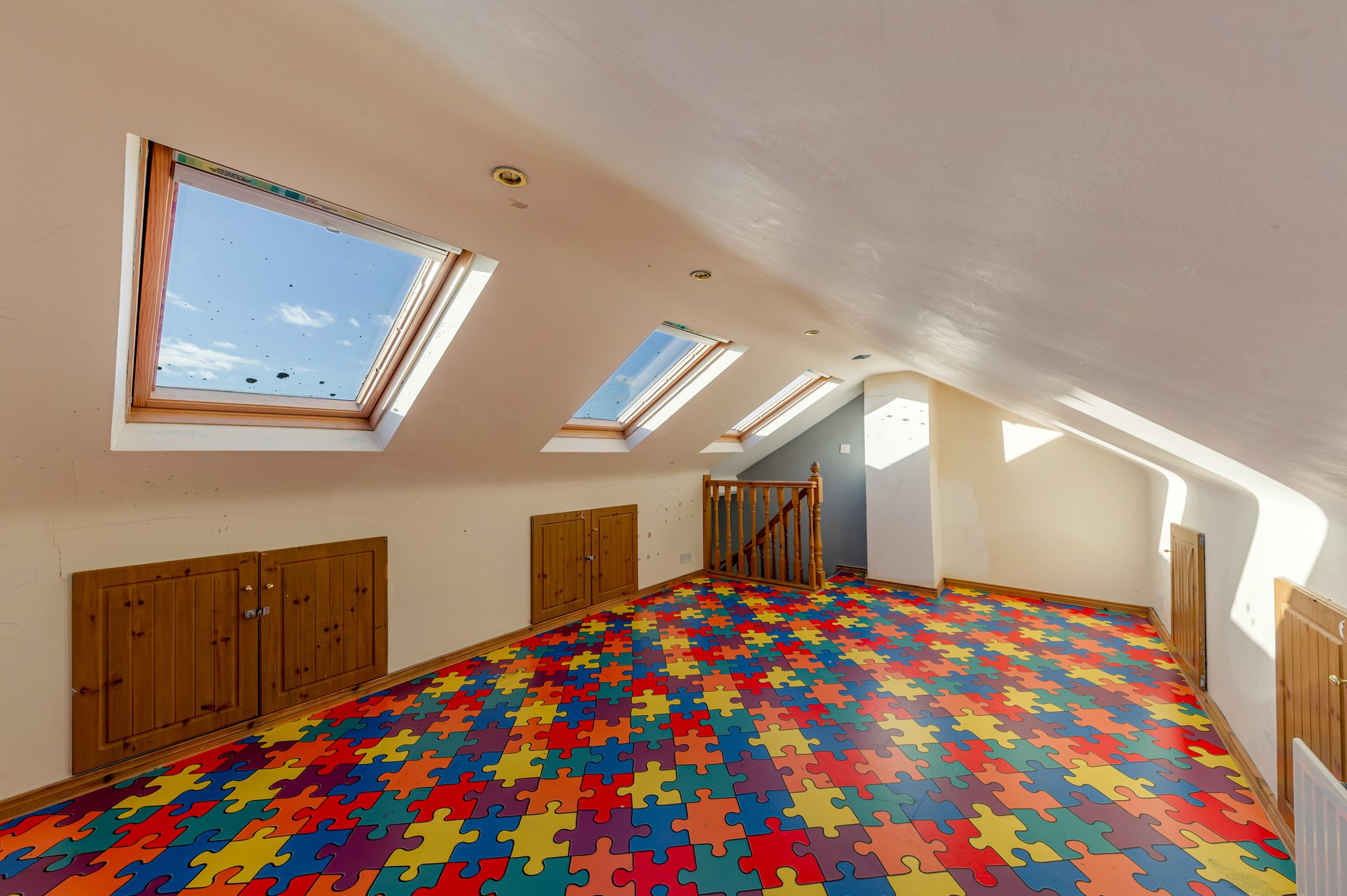 Bright and spacious room with vinyl flooring, three Velux windows letting in plenty of natural light, spotlights, and built-in eaves storage.