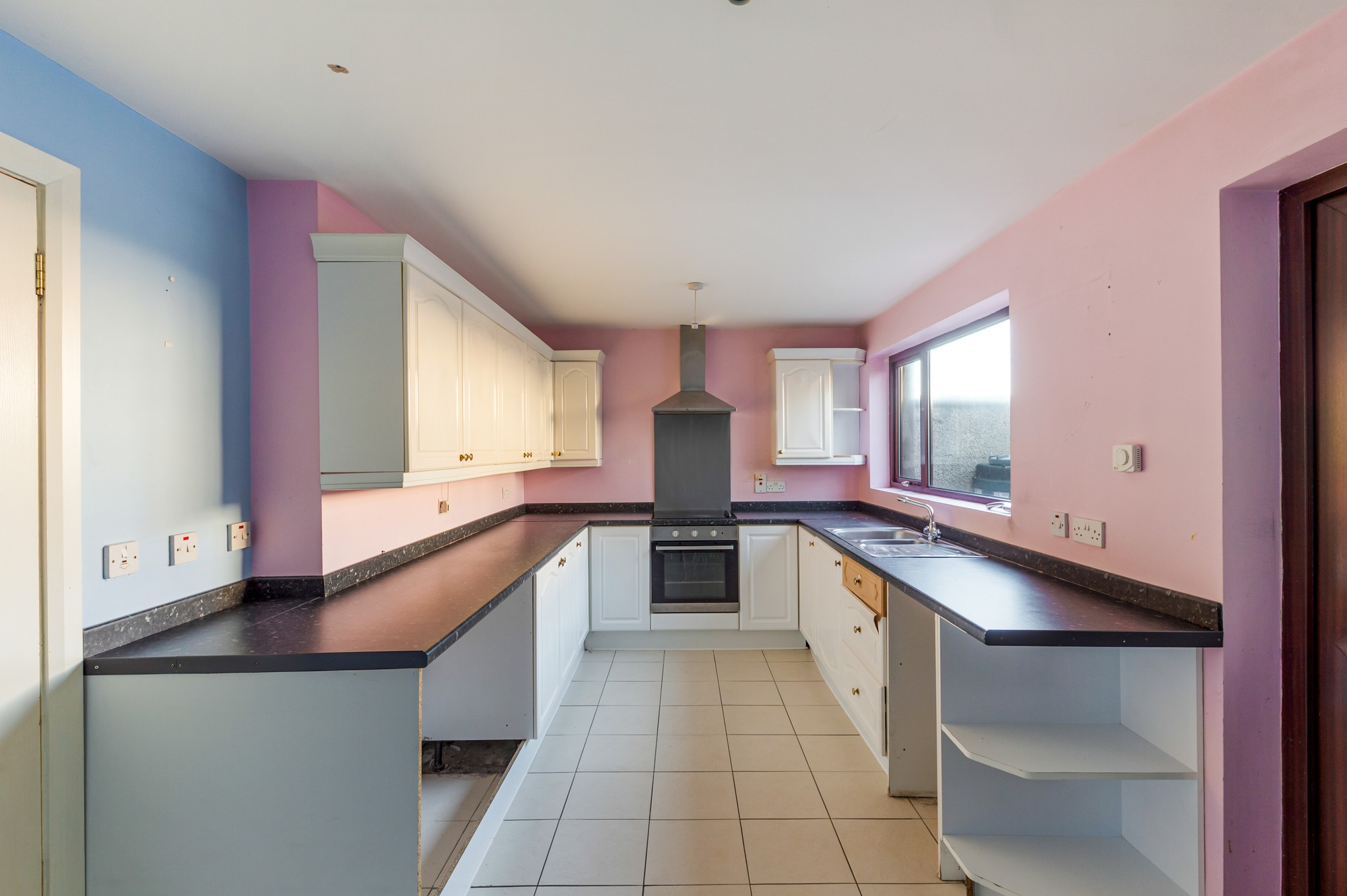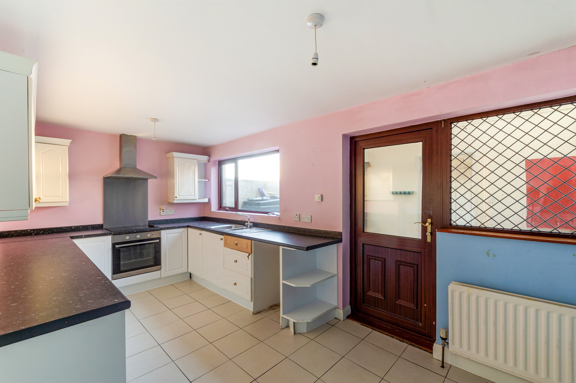 Well-appointed kitchen with a range of high and low-level cabinetry, integrated oven and hob, finished with tiled flooring and pendant lighting.