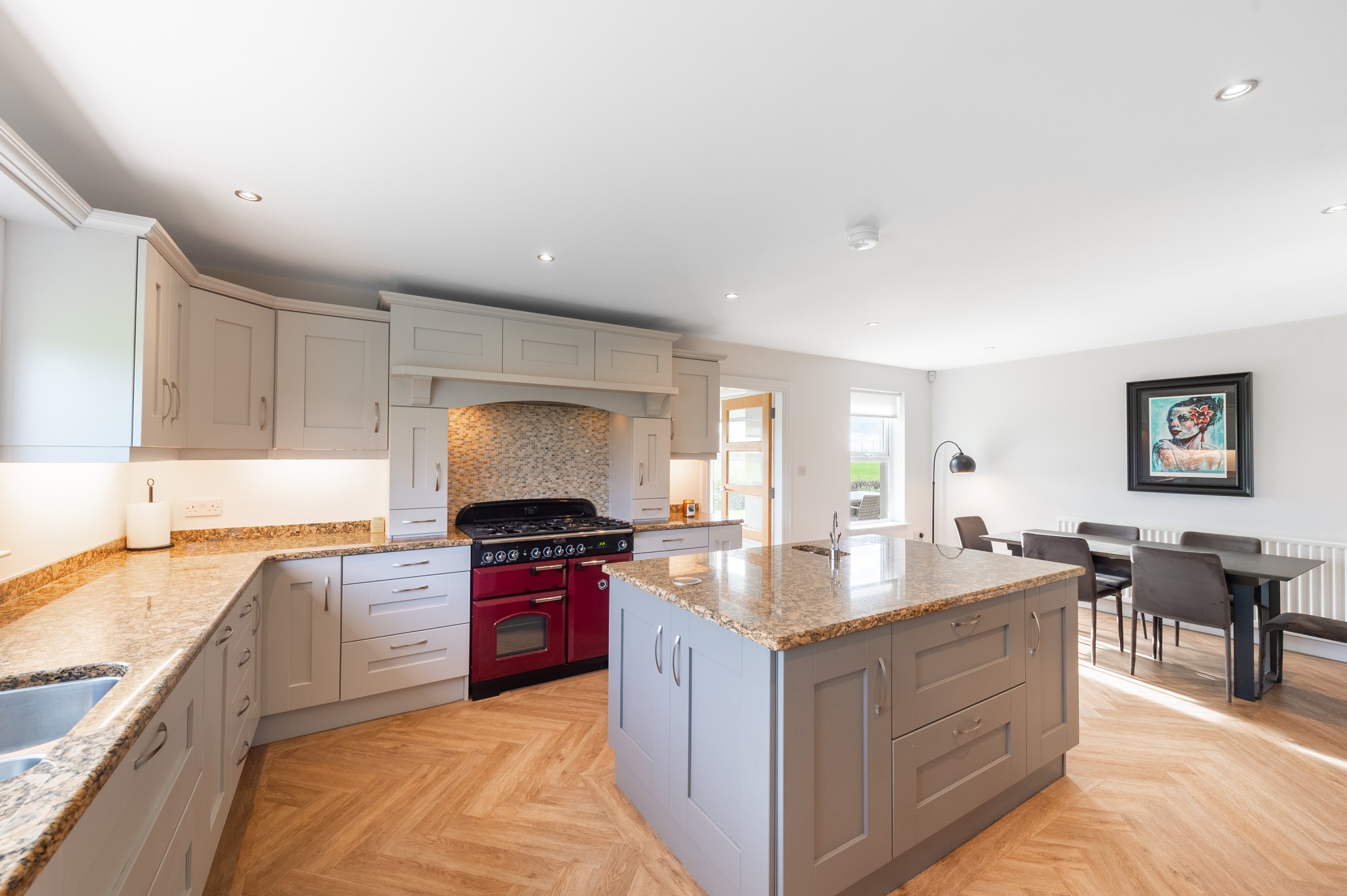 Light grey shaker-style units with contrasting island, granite worktops, integrated dishwasher and feature gas Rangemaster. Finished with herringbone LVT flooring and spotlights, open plan to the dining area.