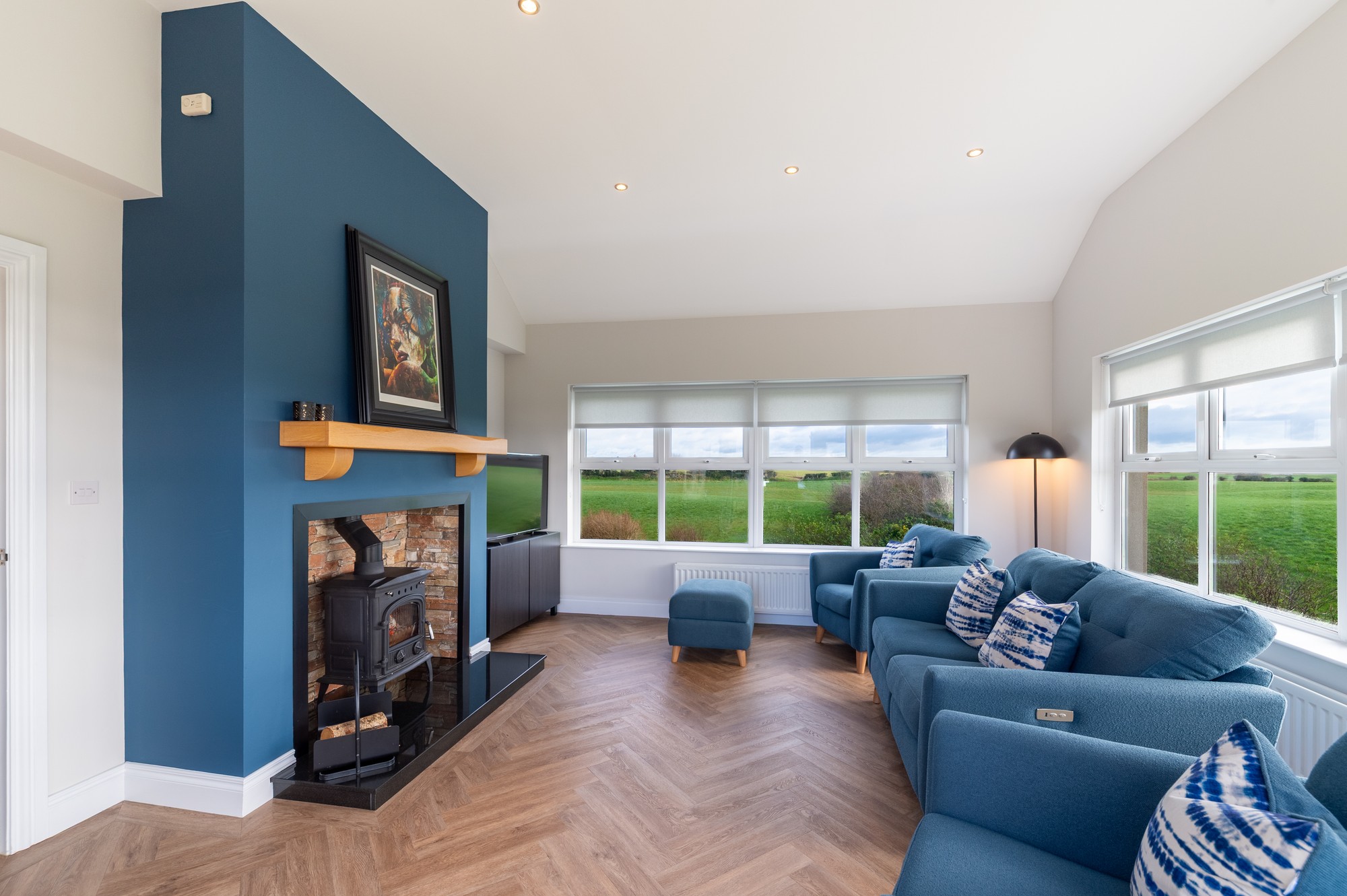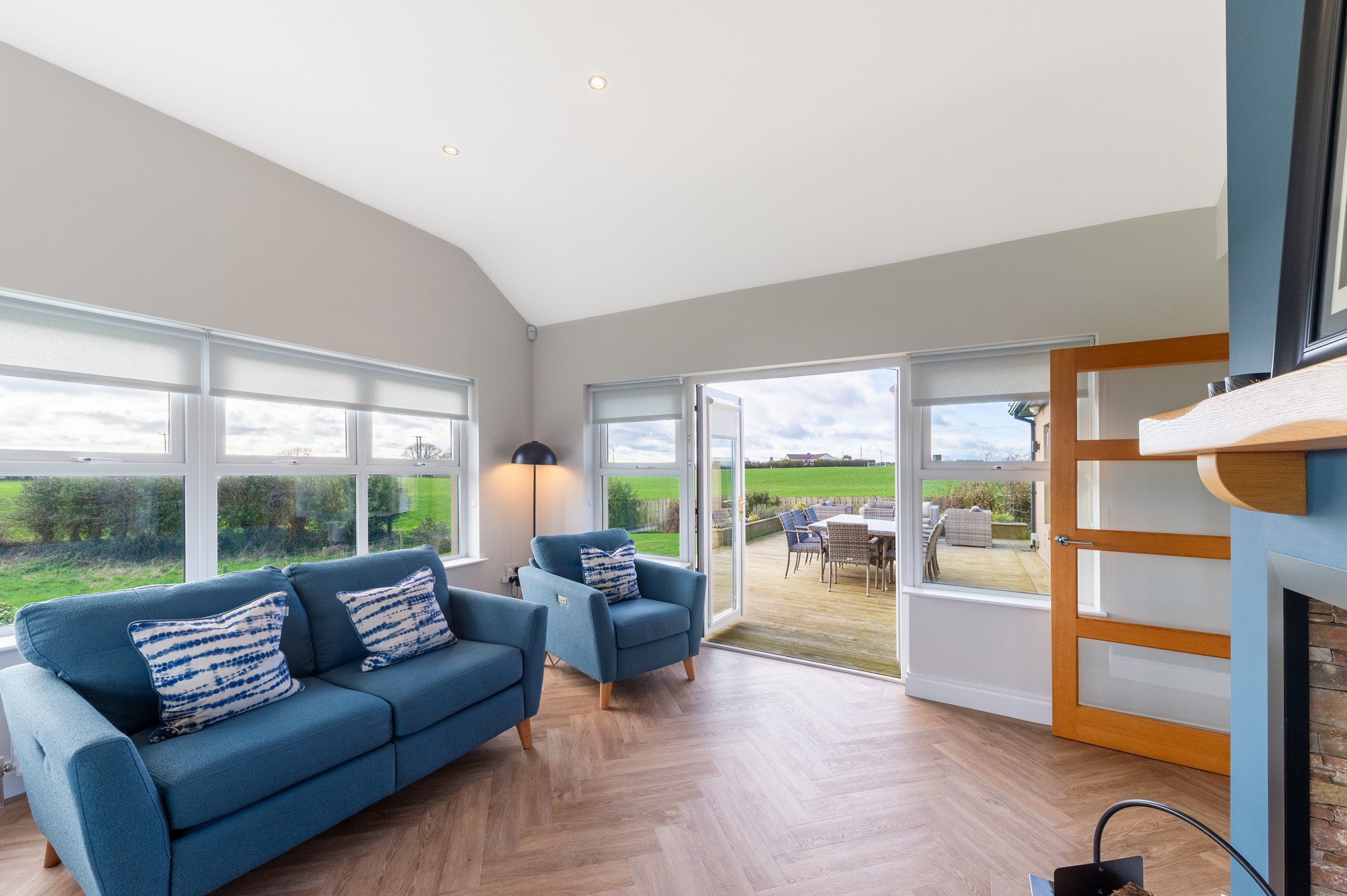 Herringbone LVT flooring, ceiling spotlights and a charming multi-fuel stove, with French doors leading to the decking area.