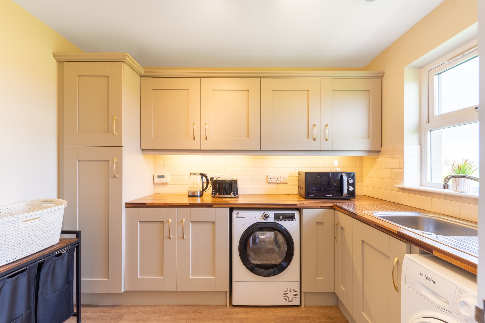 Matching kitchen cabinetry, wood-effect worktops, herringbone LVT flooring, spotlights and plumbing for appliances. Separate W/C with toilet and wash hand basin.