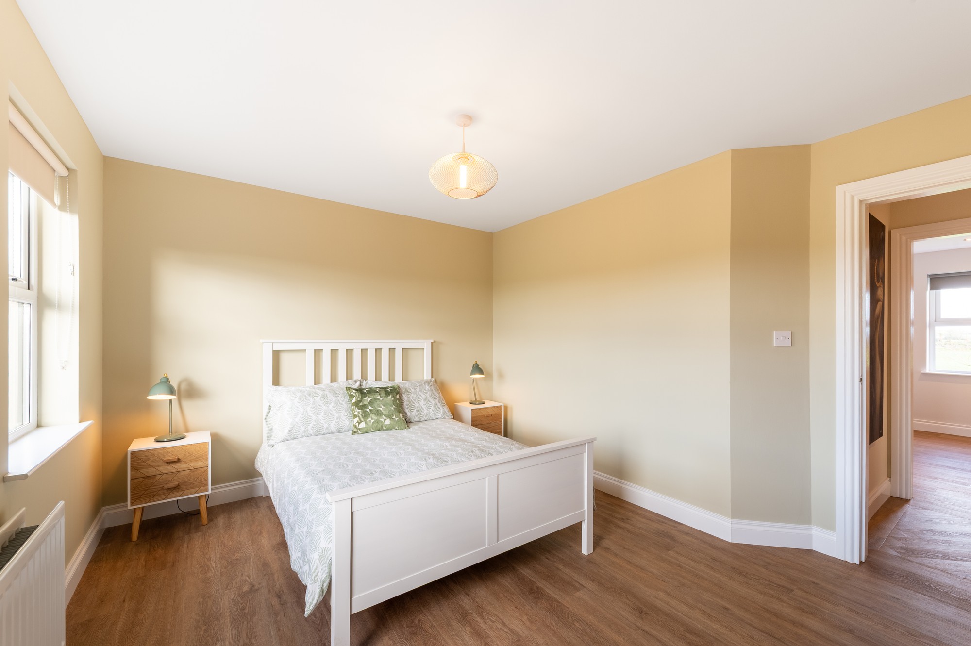 Wooden LVT flooring with pendant lighting, offering a bright and well-proportioned double bedroom.