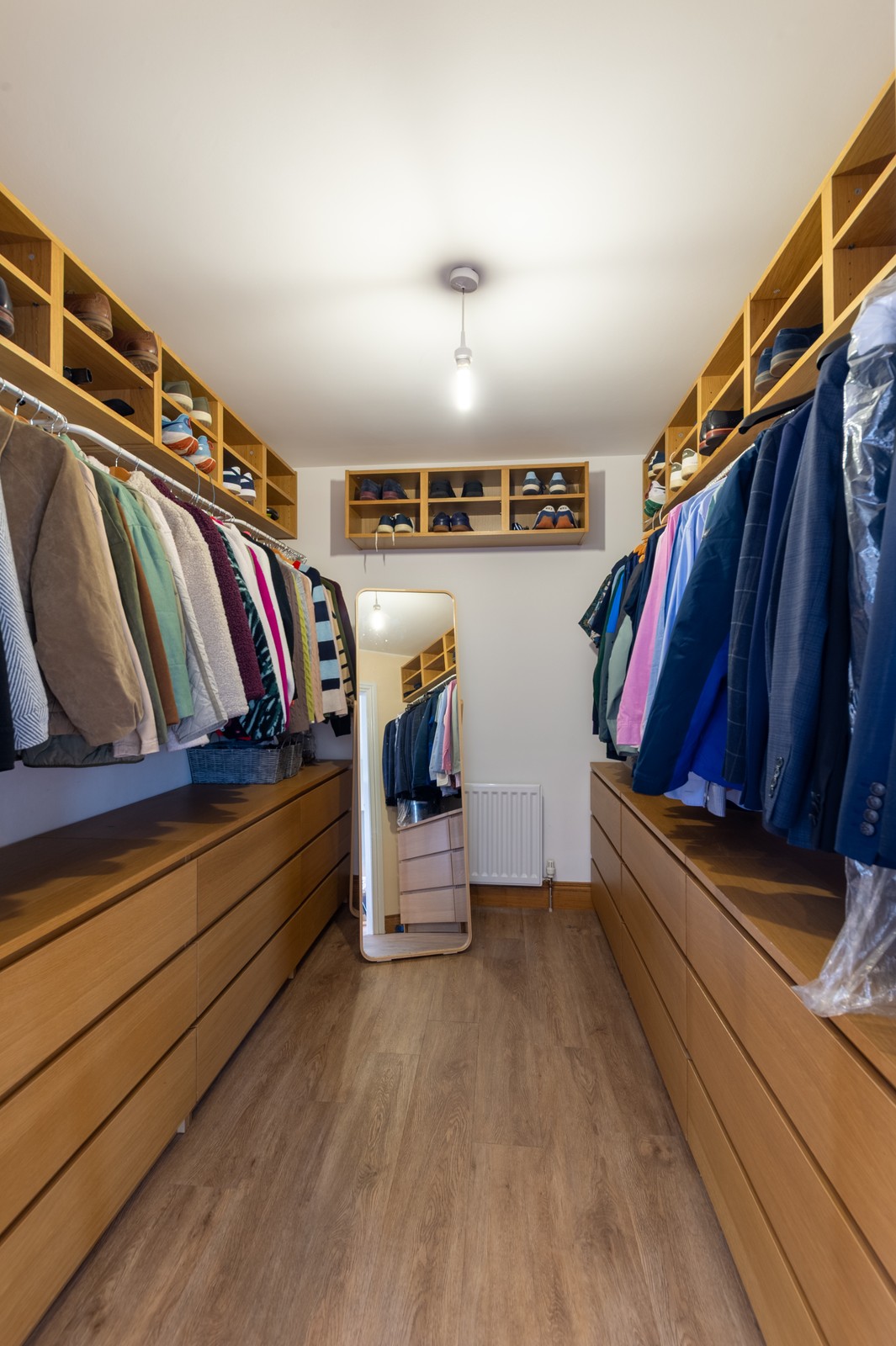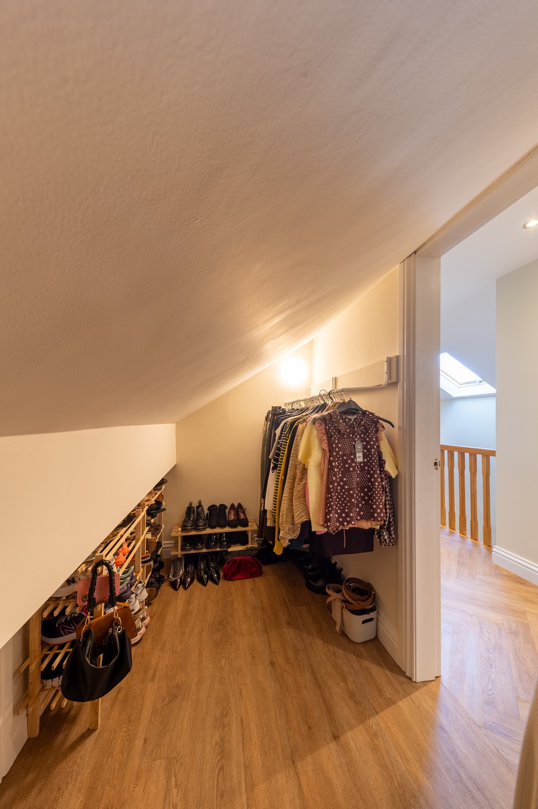 Wooden LVT flooring, ceiling spotlights and useful storage within the eaves.