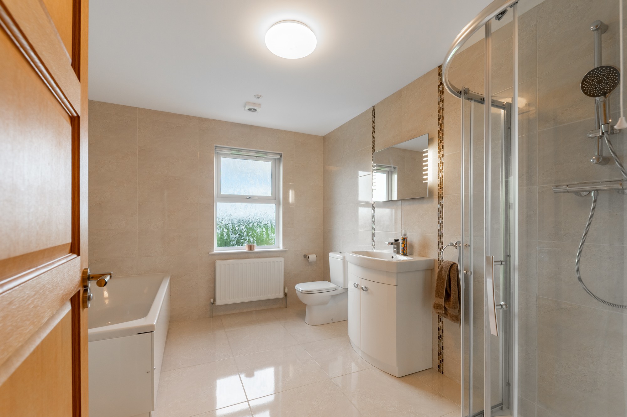 Fully tiled walls and floors with bath, separate shower cubicle, toilet, wash hand basin and flush ceiling light.
