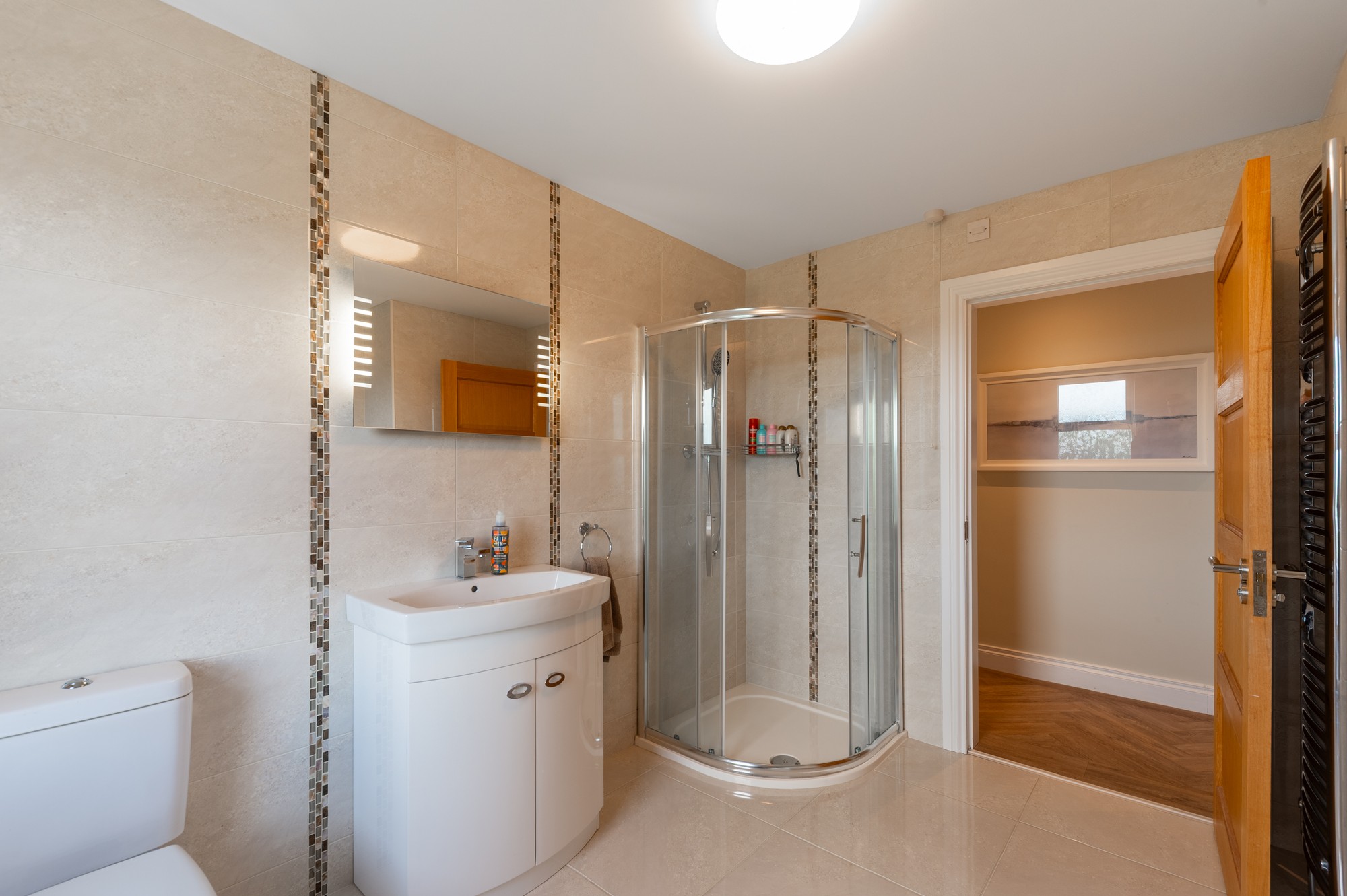 A stylish master bedroom with wooden LVT flooring, ceiling spotlights and feature wooden wall panelling, complemented by a spacious walk-in wardrobe (2.23m x 2.88m) and fully tiled ensuite with electric shower, wash hand basin and toilet.