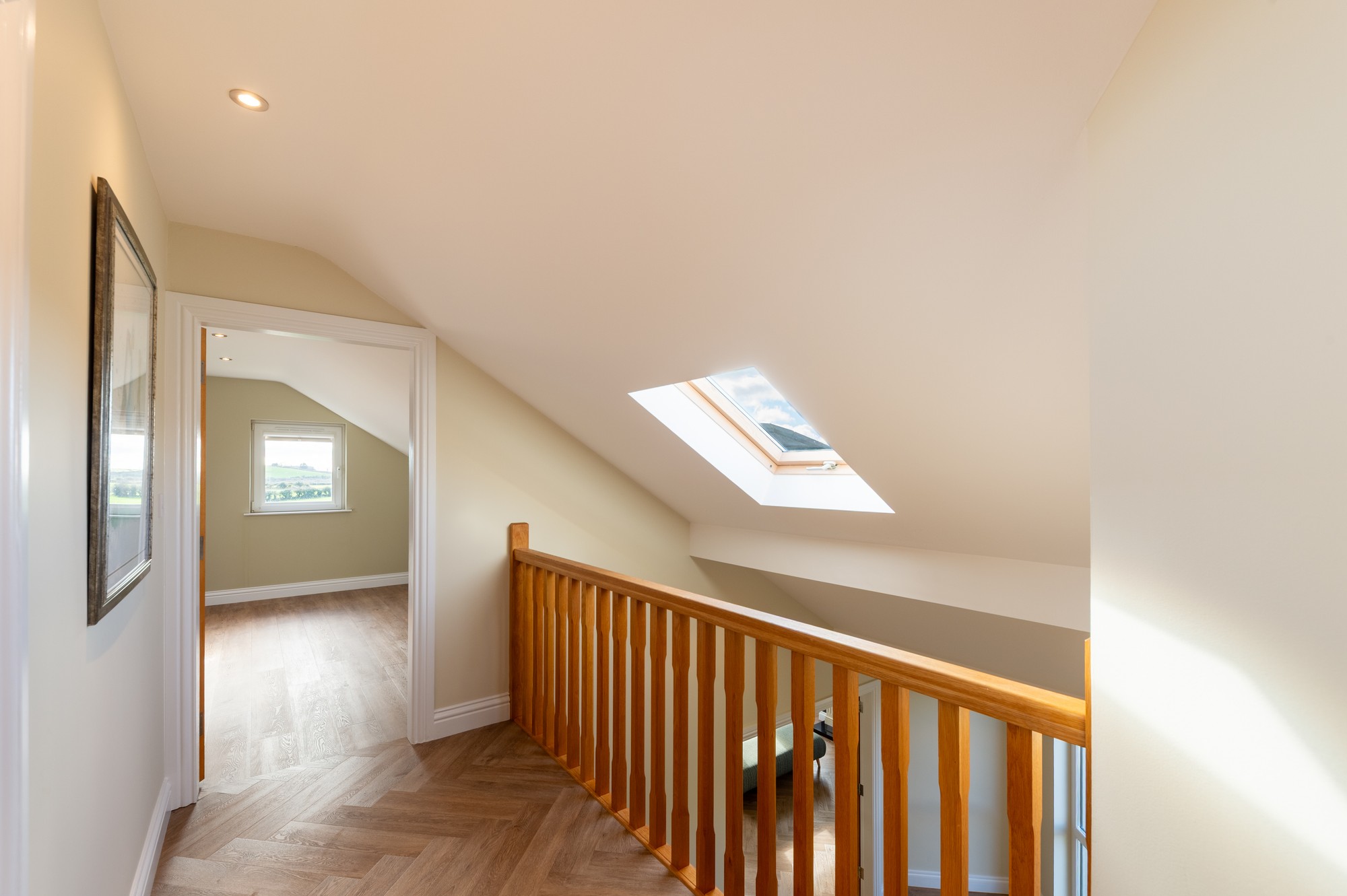 Oak staircase leading to a bright landing with herringbone LVT flooring, spotlights, Velux window and oak balcony overlooking the entrance foyer. Built-in storage: Room 1 – 1.76m x 2.56m, Room 2 – 1.76m x 3.88m, Room 3 – 1.34m x 2.60m.