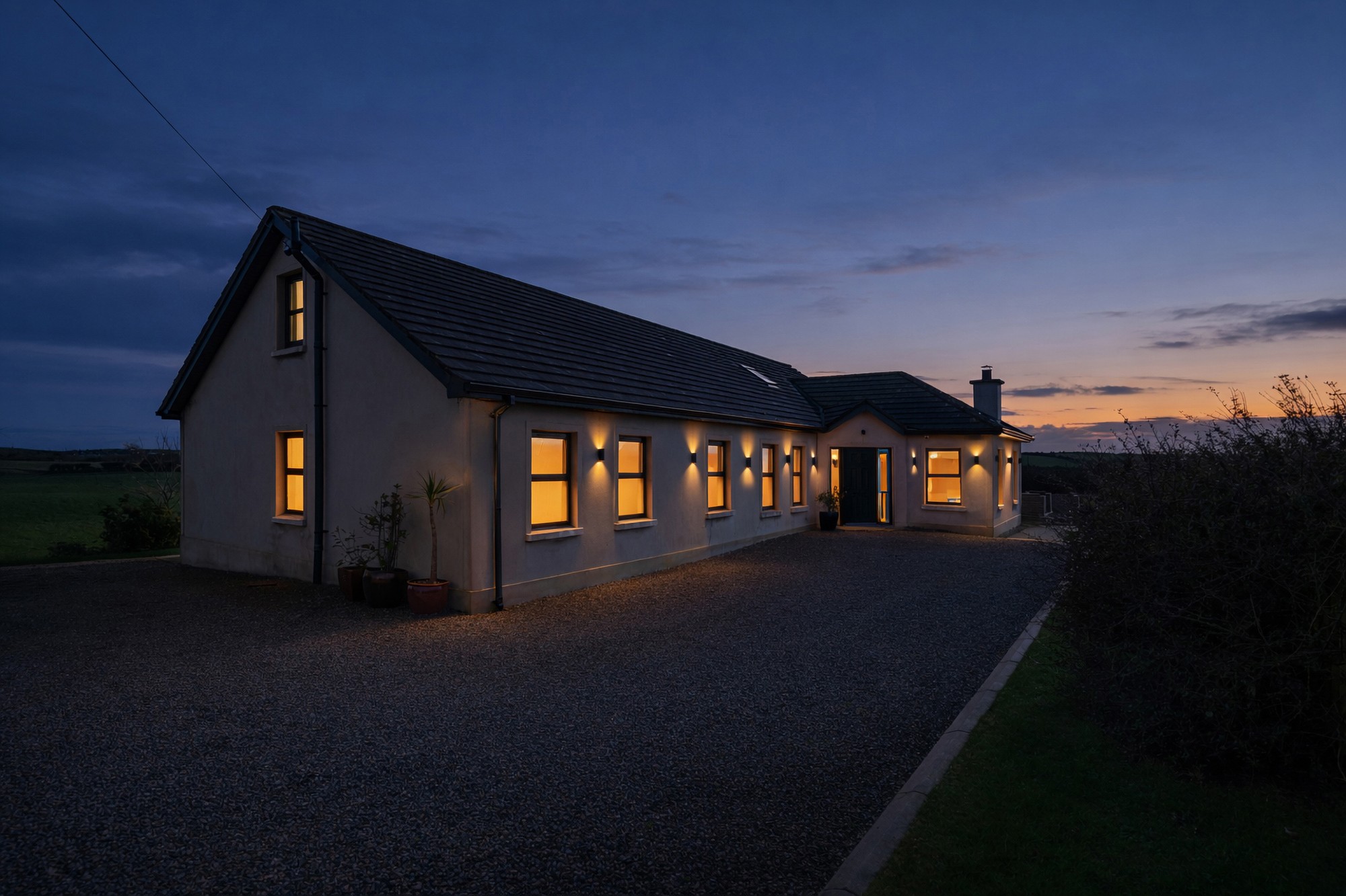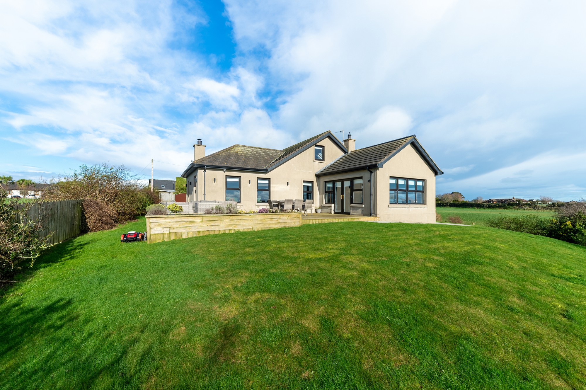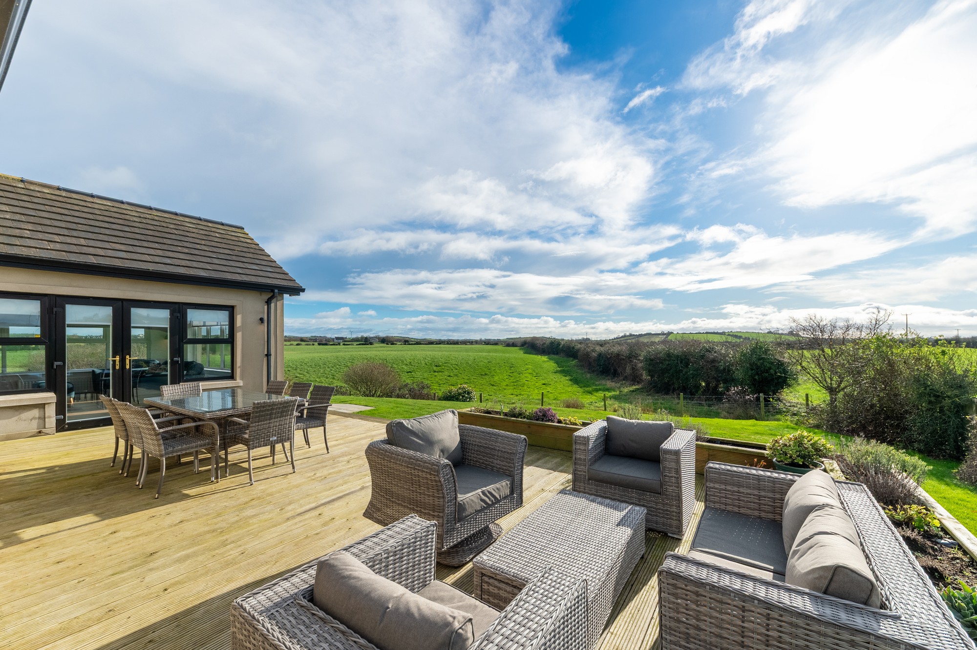 Externally, the property continues to impress. A gated entrance opens onto a stoned driveway leading to a detached double garage, while the elevated, landscaped gardens provide privacy, security and uninterrupted countryside views. The decking area, accessed from the sunroom, creates a perfect setting for outdoor entertaining, and the exterior lighting ensures the home looks exceptional after dark.
