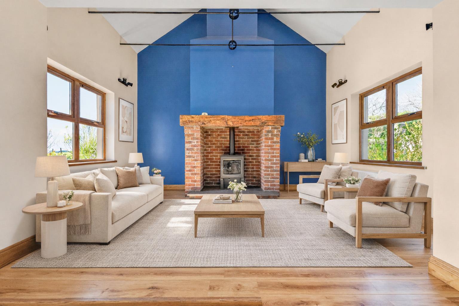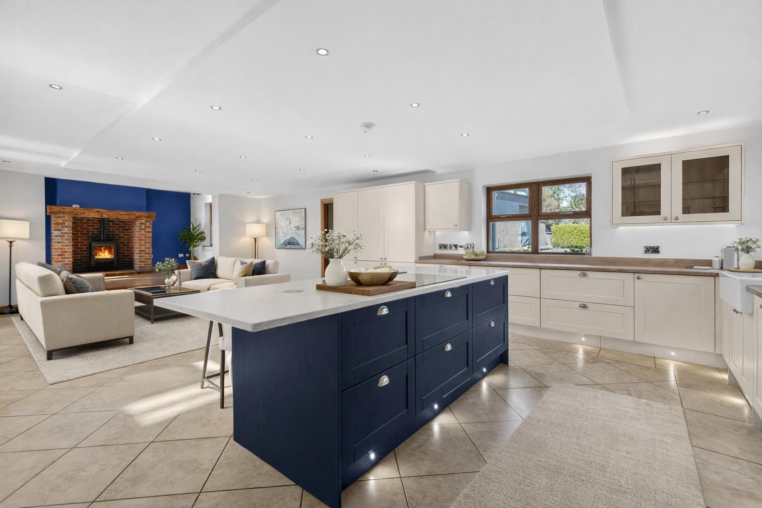 The accommodation is bright, spacious, and flexible across two floors. The ground floor includes a welcoming living room with solid oak flooring, a polished limestone fireplace, and open fire. A superb modern fitted kitchen opens into a casual dining and family area, while a separate family room features a large cast iron wood-burning stove set in a brick recess. There is also a sun room with a striking vaulted ceiling, plus a guest bedroom with en suite shower room.