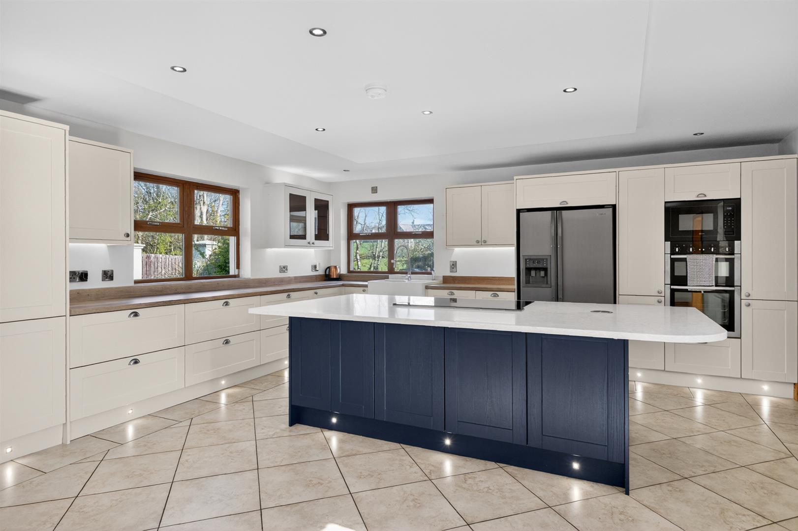 Range of high and low level Shaker style units, laminate work surfaces, double bowl sink unit with mixer tap, recess and plumbed for ice dispensing fridge freezer, integrated Neff double oven, integrated Neff microwave, integrated dishwasher, larder cupboard, large island unit with additional storage cupboards, quartz work surfaces, Neff five ring induction hob, draw-down extractor fan, breakfast bar, fully tiled floor, glass display cabinets with built-in lighting, open plan to family room.
