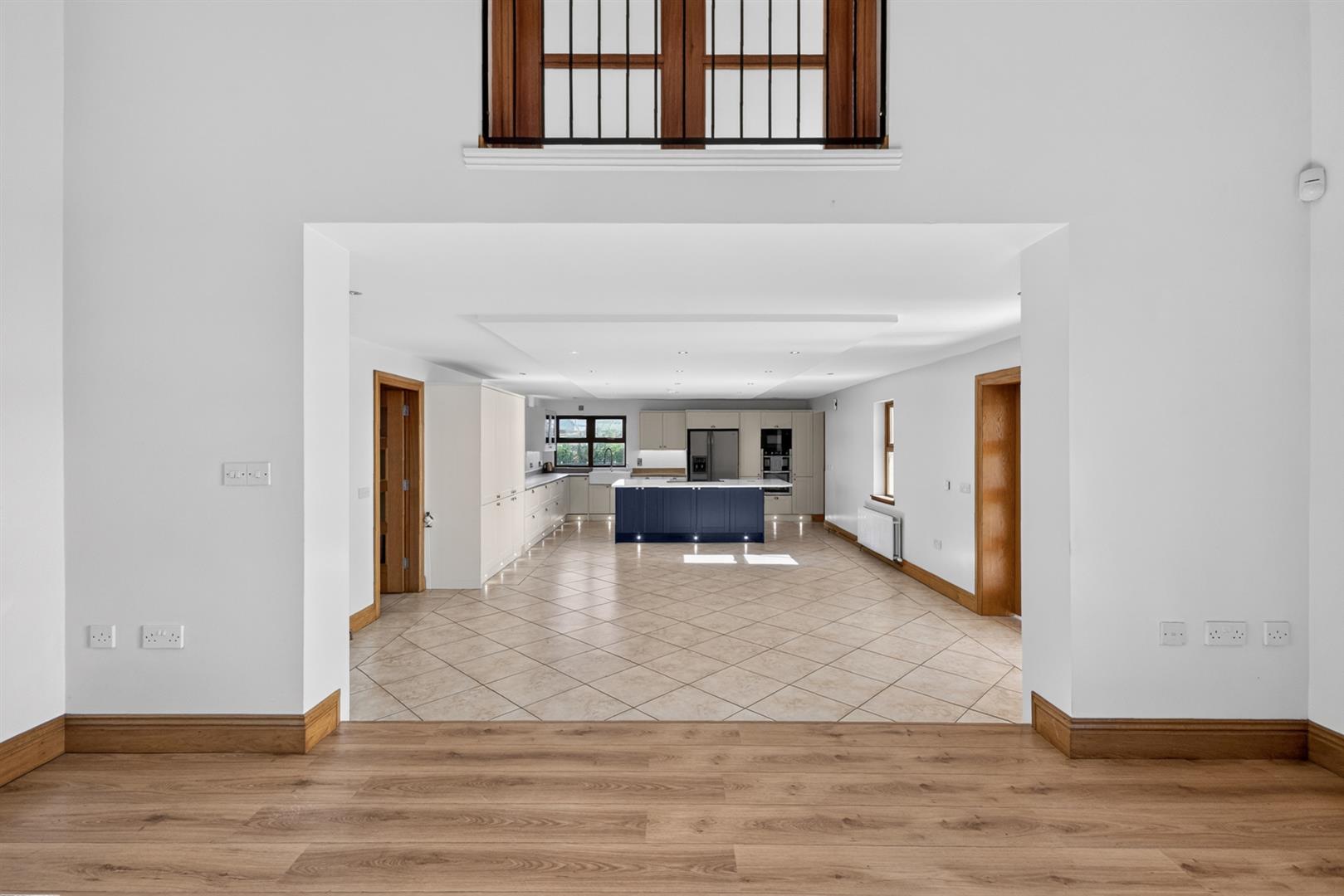 Upstairs, a spacious landing with solid oak flooring incorporates a study area. There are four well-proportioned bedrooms, including a main bedroom with dressing room, en suite shower room, and French doors leading to a minstrel gallery overlooking the family room. A fully tiled bathroom includes a four-piece suite with panelled bath and separate shower cubicle. Additional features include oil-fired central heating, uPVC double glazing, a downstairs WC, utility room, boot room, and pressurised water system.