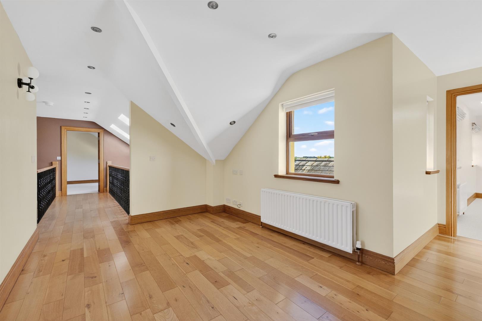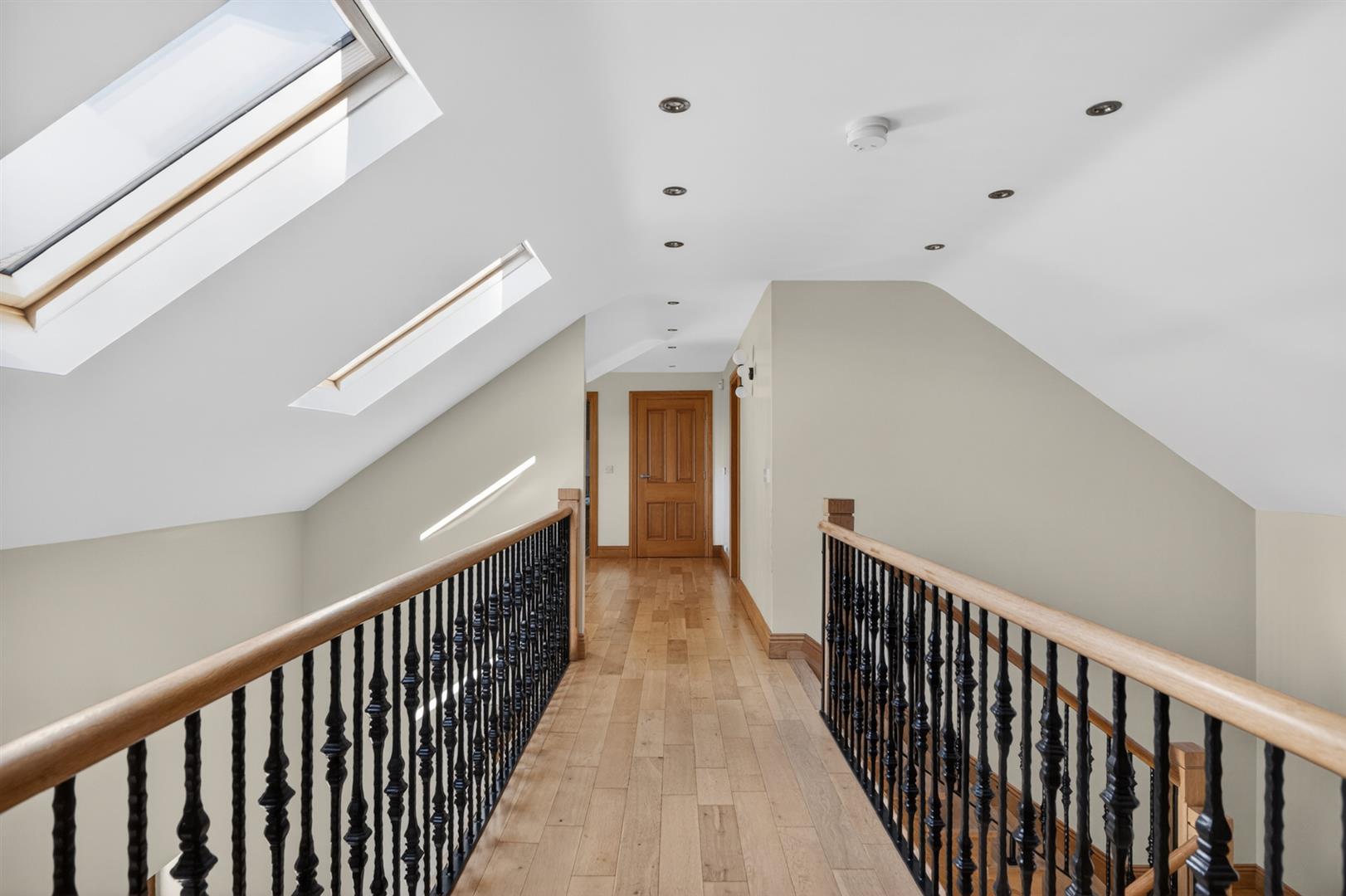 Bright and spacious landing with solid oak floor, study area, shelved airing cupboard with pressurised water system.