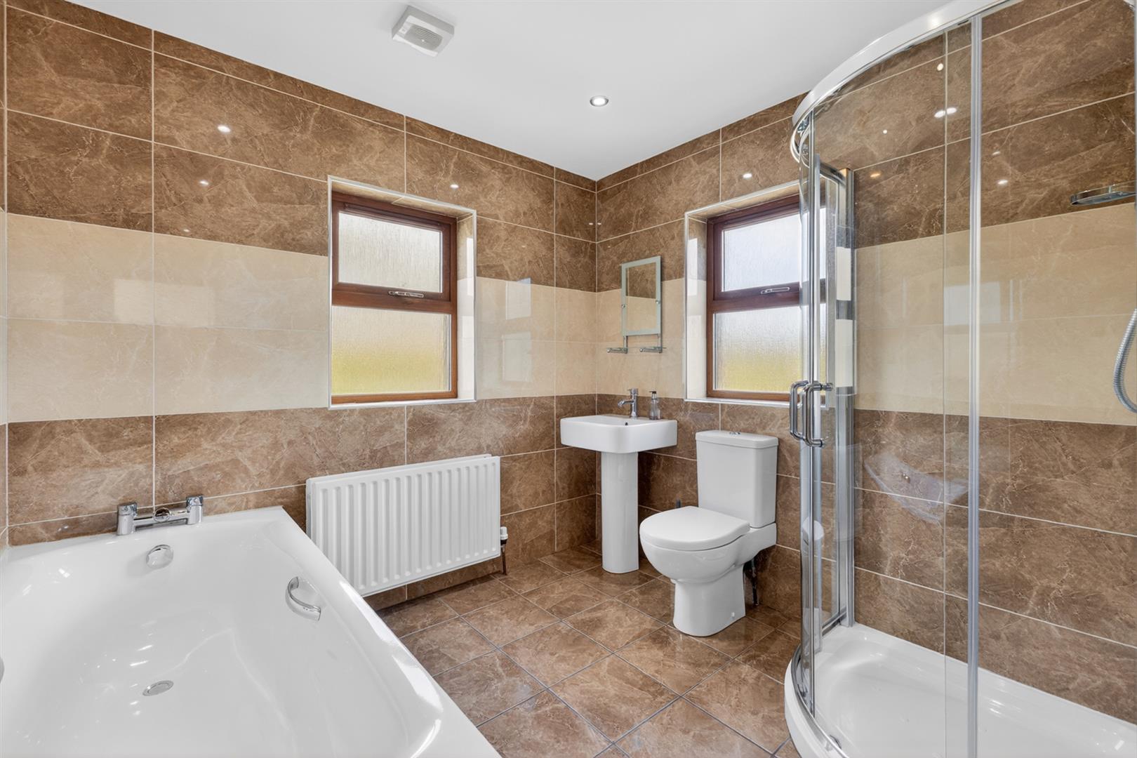 Four piece suite comprising tiled panelled bath, separate built-in fully tiled shower cubicle, pedestal wash hand basin, mixer tap, low flush WC, fully tiled floor, fully tiled walls, chrome heated towel rail, extractor fan.