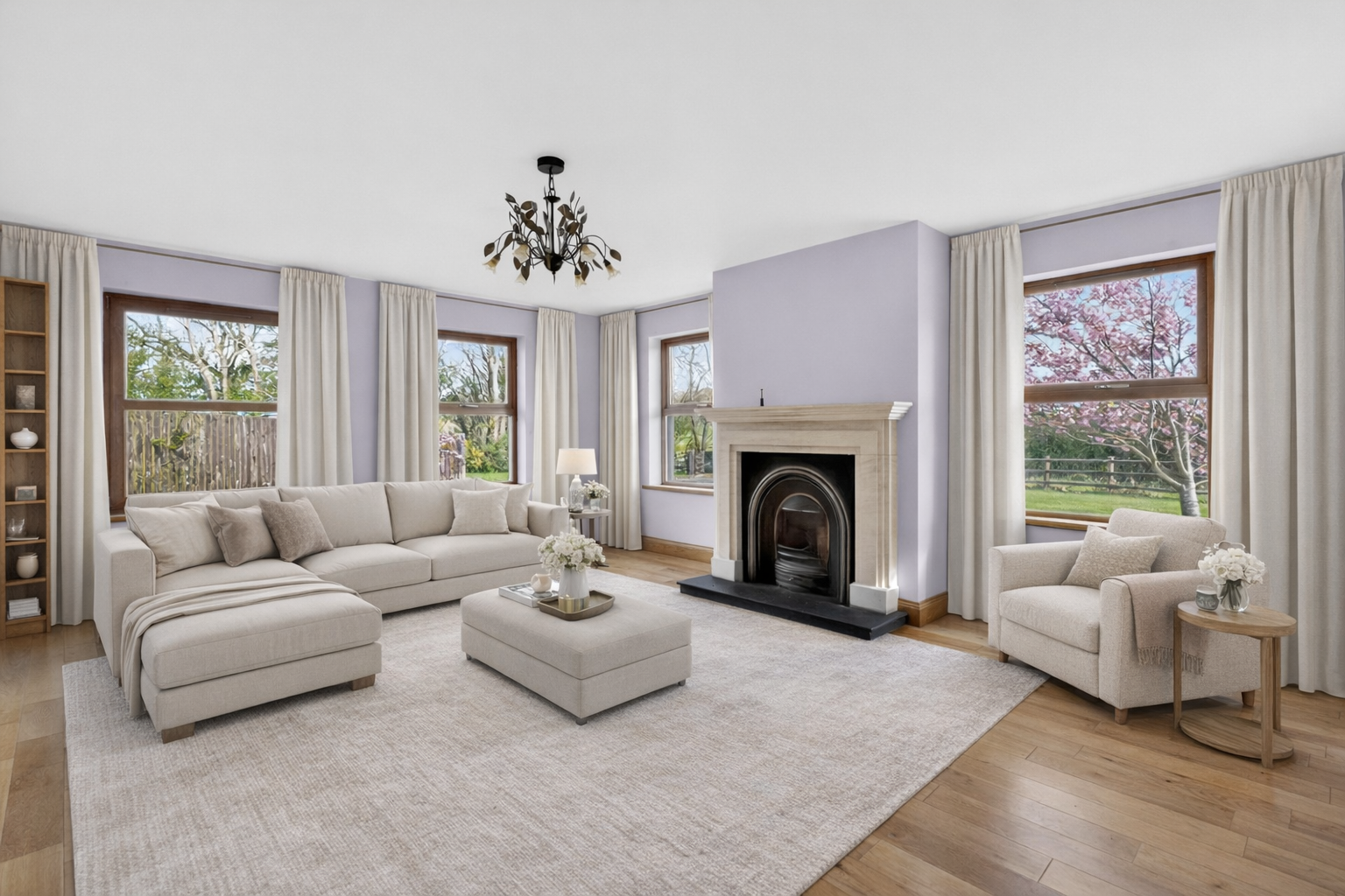 Living Room with Solid Oak Floor, Attractive Polished Limestone Fireplace and Open Fire