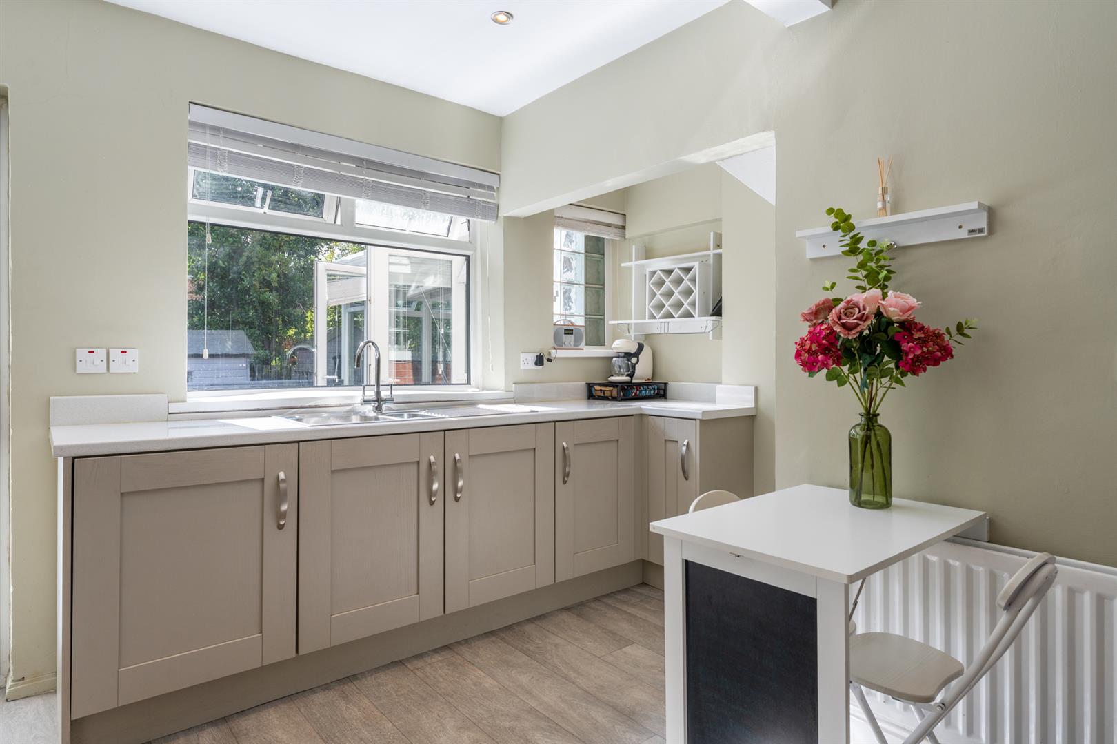 Laminate wooden floor, PVC double doors to rear garden.