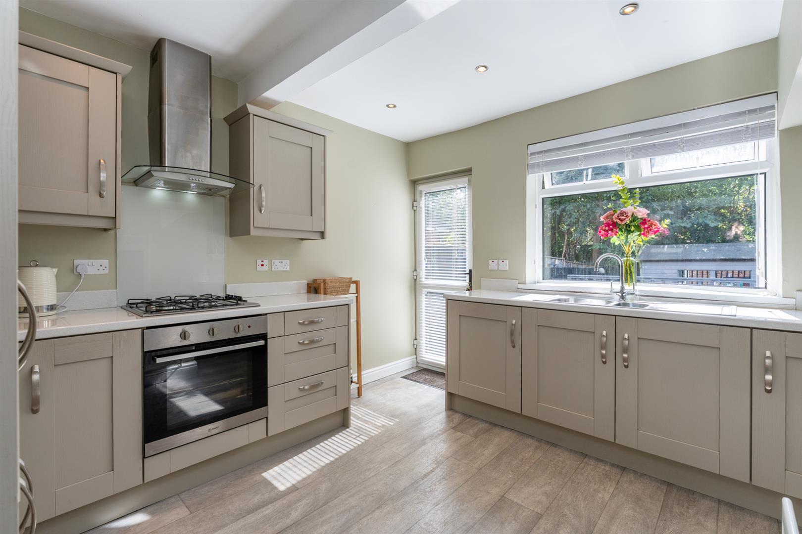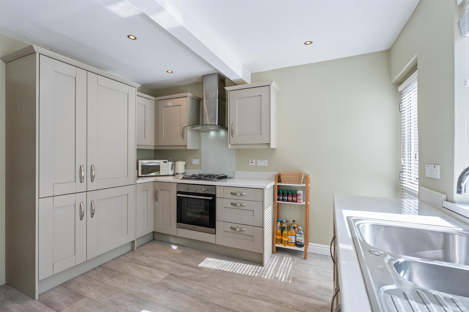 Excellent range of high and low level units, single drainer stainless steel sink unit, stainless steel over and gas hob, integrated fridge freezer, plumbed for washing machine, storage under stairs, recessed spotlighting.