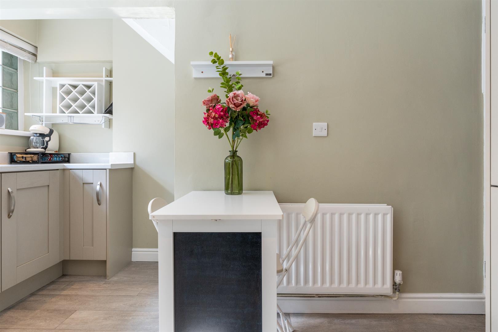Laminate wooden flooring, storage cupboard housing gas fired boiler.