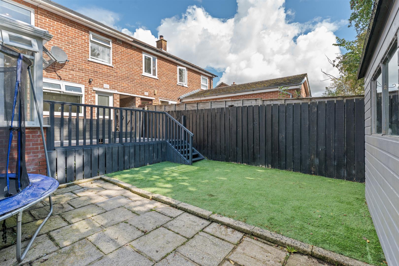 South Facing Enclosed Rear Garden With Raised Decking Area and Artificial Lawn