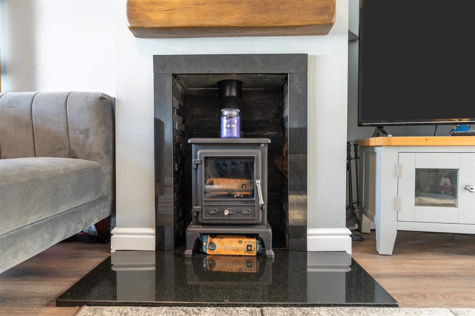 Laminate wooden floor, cast iron wood burning stove with granite inset and hearth, wooden beam mantle, PVC doors to: