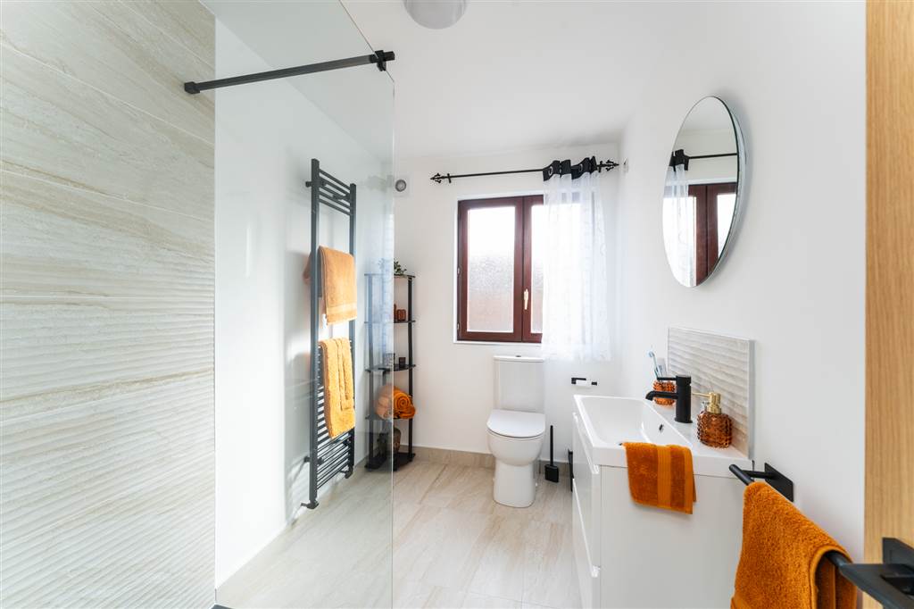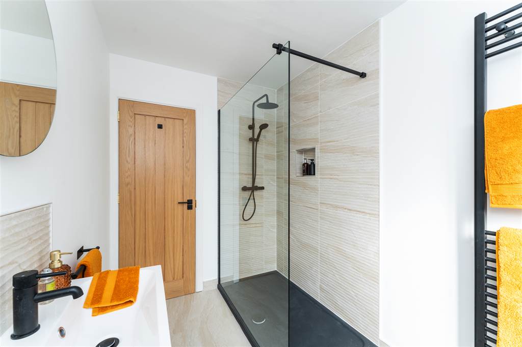 Walk in tiled cubicle with Thermostatic shower and round rain fall shower head, vanity wash hand basin and low flush wc. Heated towel rail and tiled floor.