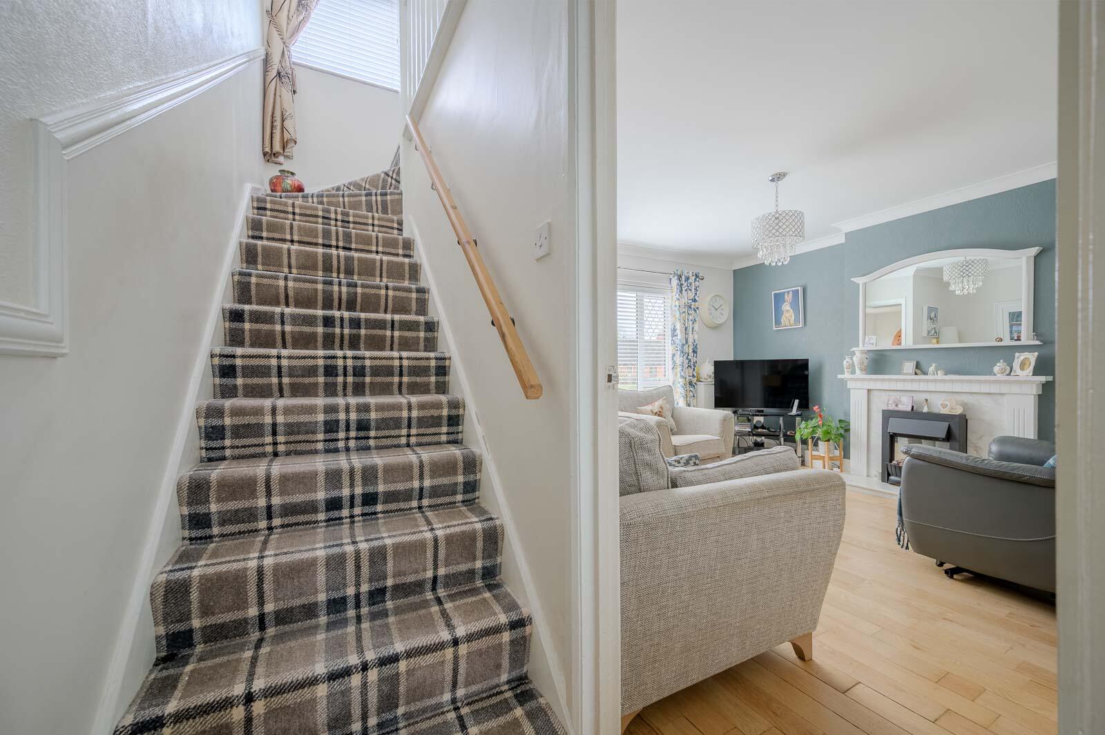 With PVC double glazed front door with glazed inset, solid wood flooring, storage under stairs with hanging space.