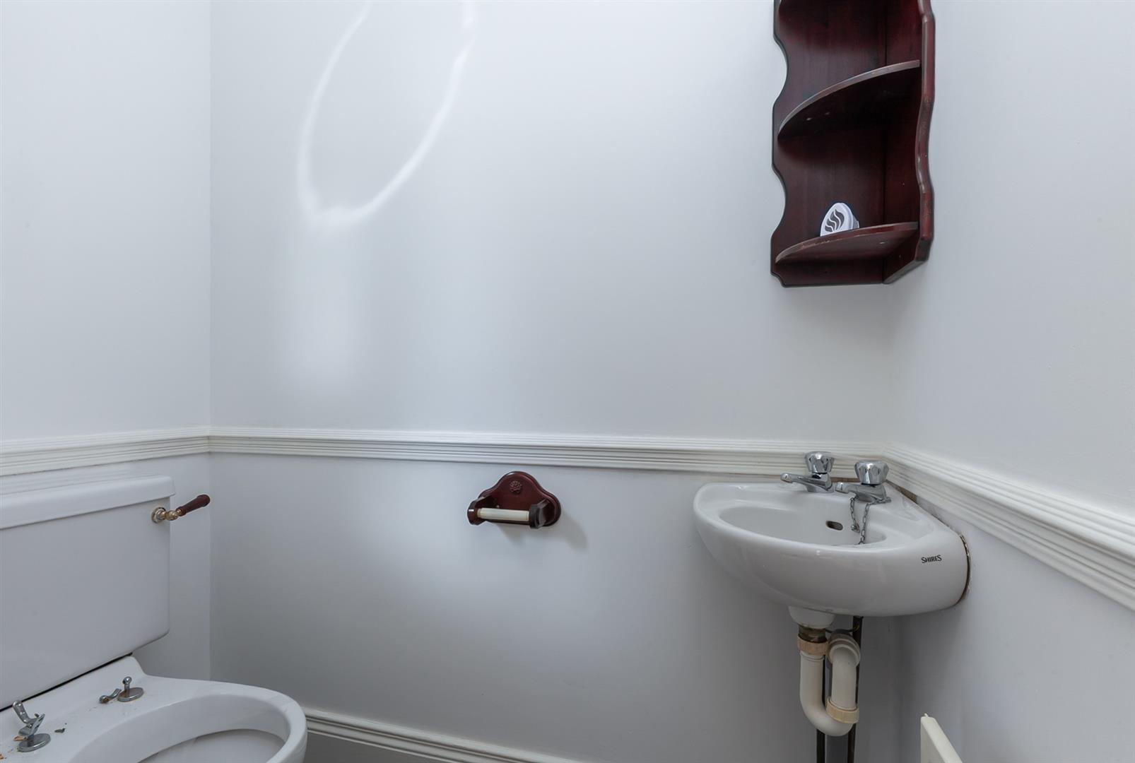 White suite comprising: Walk in shower cubicle with tiled walls and shower screen, pedestal wash hand basin, part tiled walls, fully tiled floor, extractor fan.