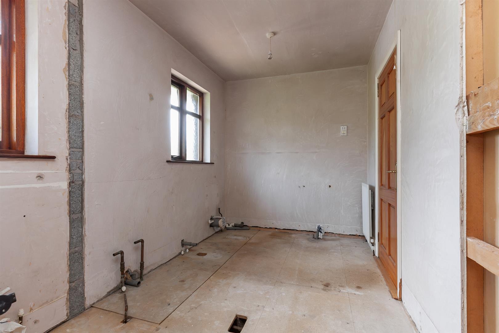 Extensive range of high and low level units, single drainer sink unit with mixer tap, space for cooker, part tiled walls, leading to: