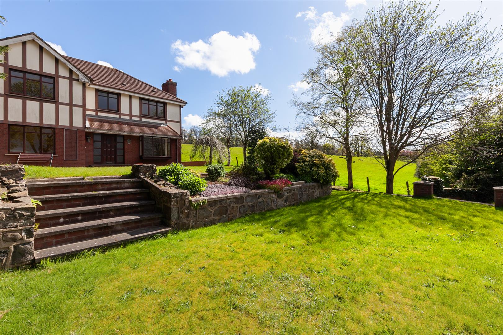 Driveway to front with ample parking, leading to detached double garage. Gardens in lawn to front with mature trees and shrubs. Large patio area to rear with gardens in lawn.