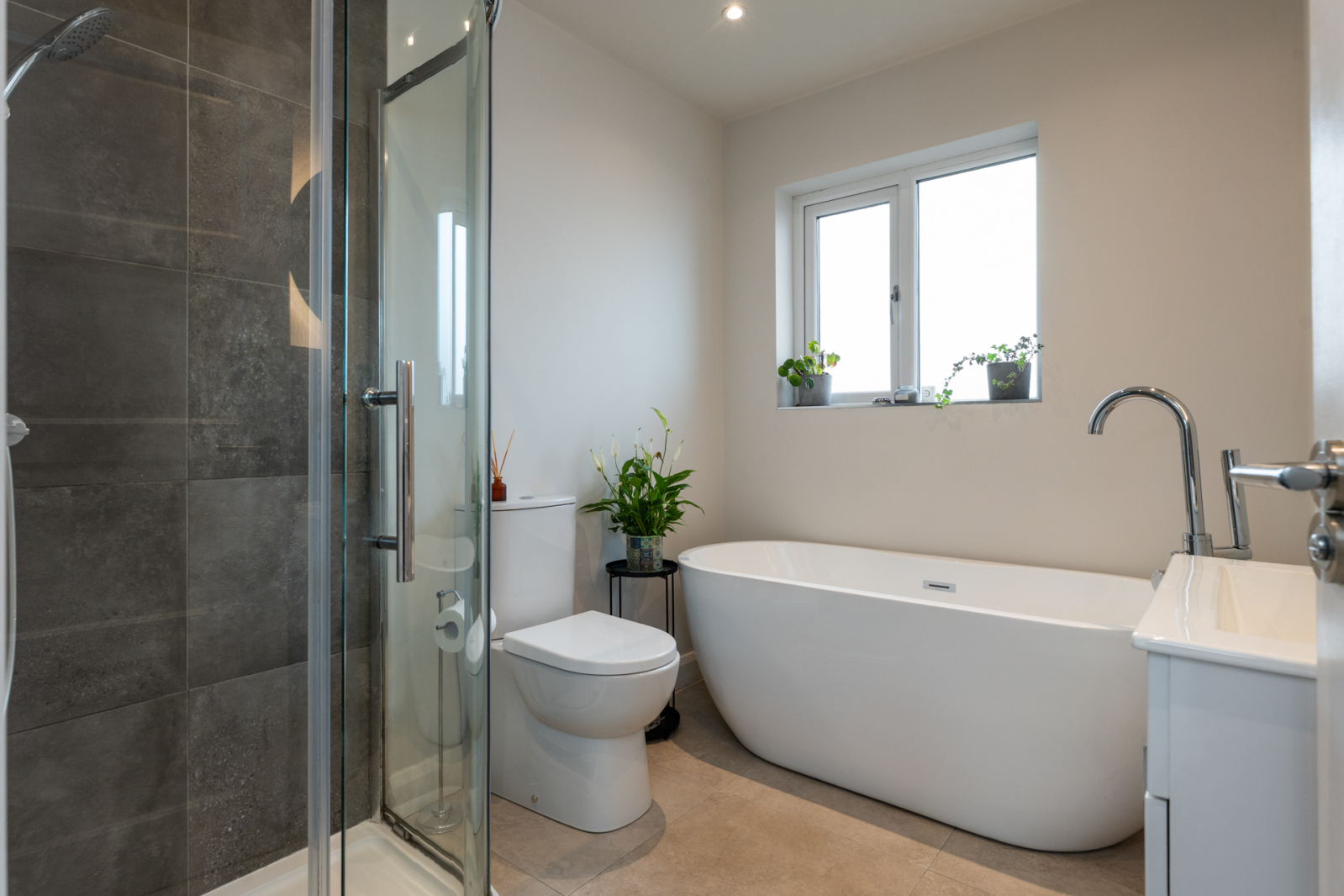 White suite comprising of low flush WC, wash hand basin with mixer tap, storage below, tiled flashback, free standing bath with swan neck tap, mixer tap and handset, walk-in thermostatically controlled shower, rainfall shower head and handset, partly tiled walls, tiled flooring, recessed spotlighting, extractor fan.