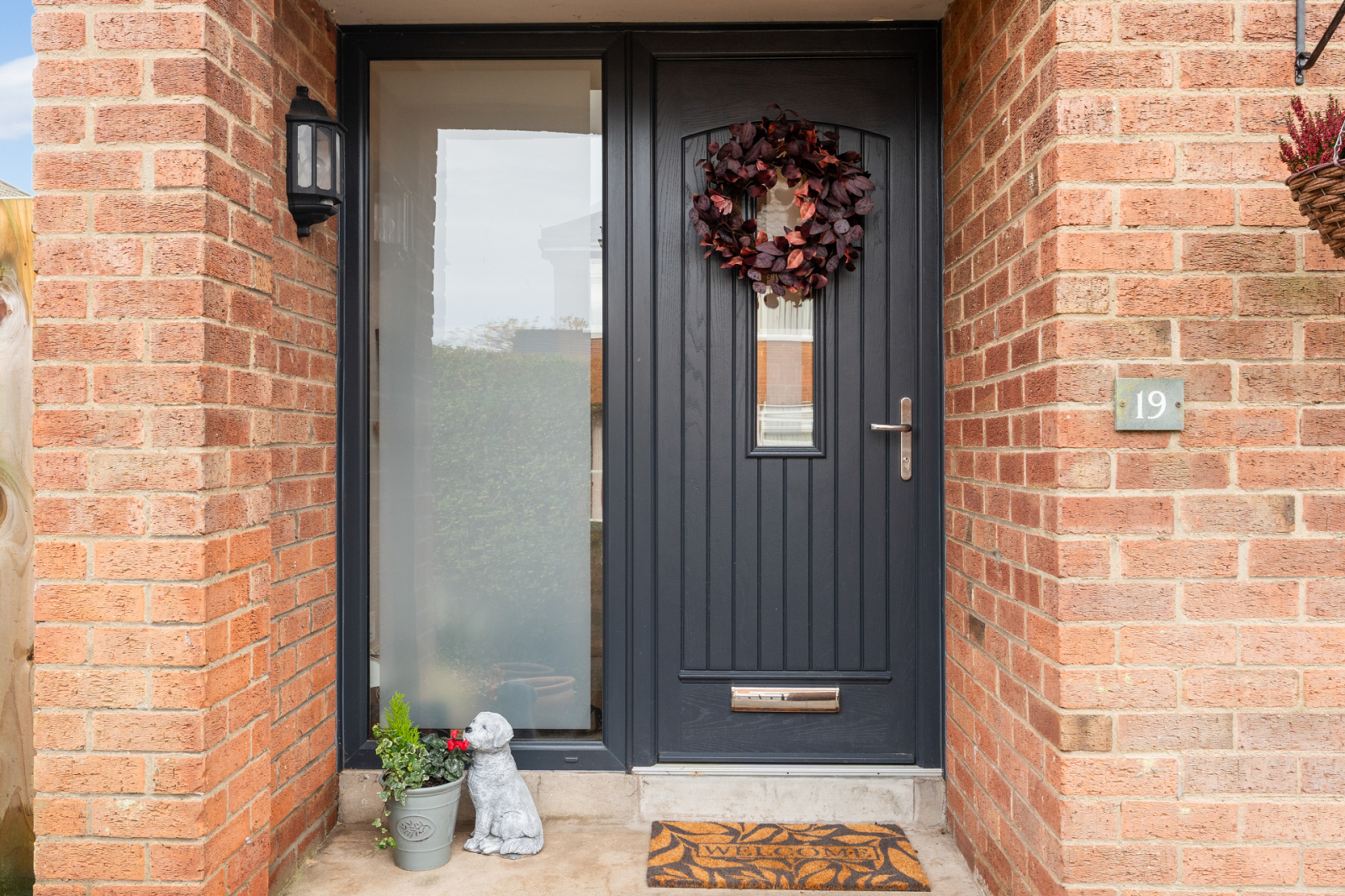 Composite front door with glass inset, matching side light, leading through to reception hall.
