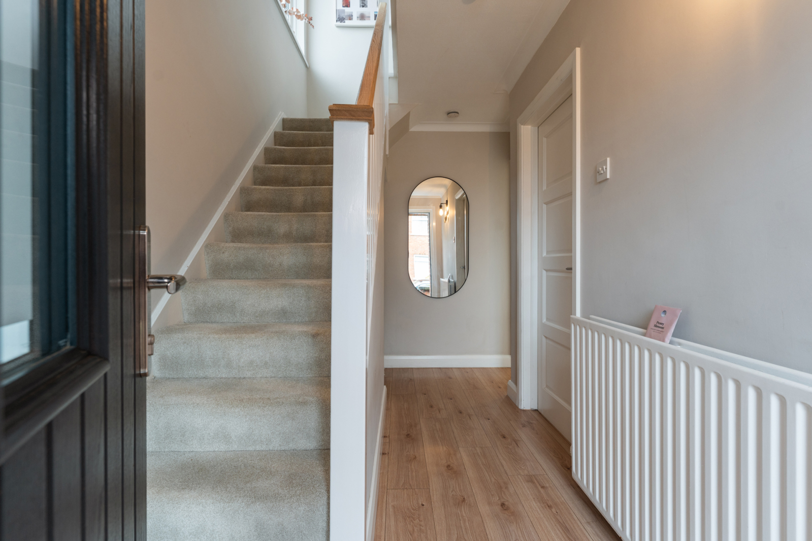 Cornice ceiling, laminate wood effect flooring, open cloaks area, storage below stairs.