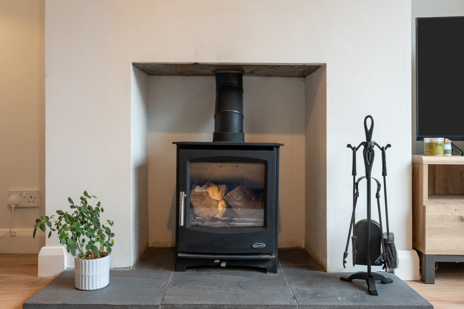 Outlook to front, cornice ceiling, hole in the wall fireplace with cast iron wood burning stove, slate hearth.