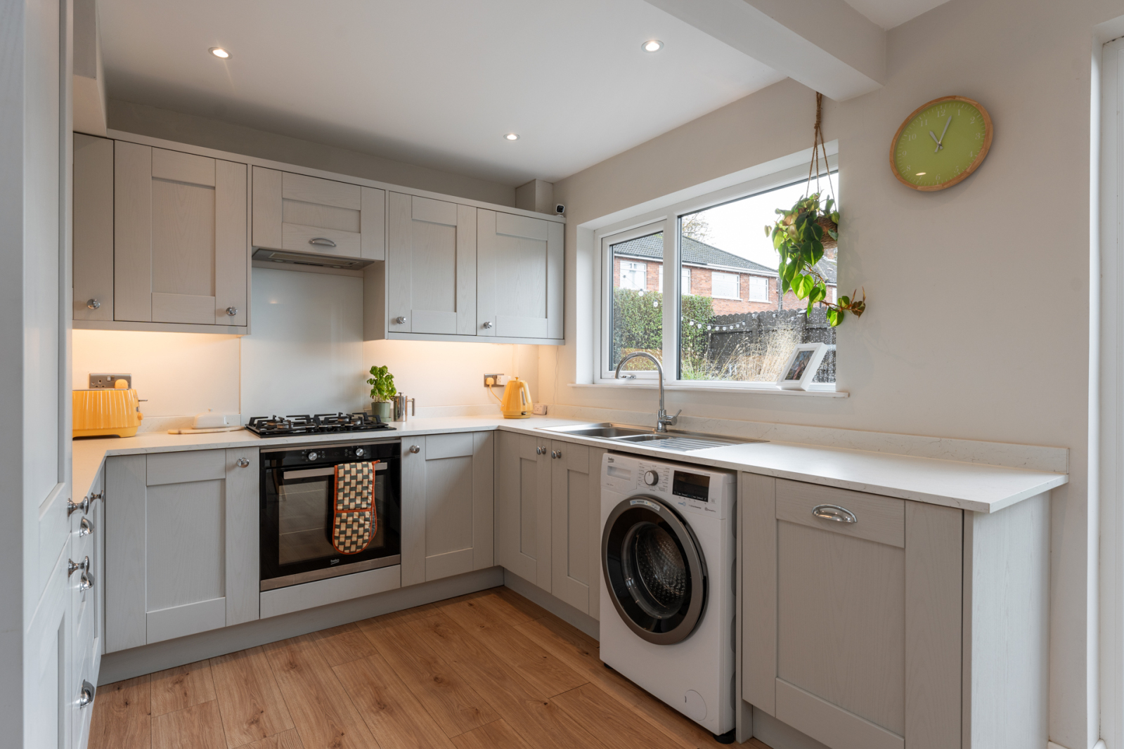 Fantastic range of high and low level units, laminate work surfaces with stainless steel sink unit and drainer 1.5 tub, mixer tap, integrated oven, four ring gas hob, glass kitchen splashback, integrated extractor fan, integrated fridge freezer, integrated dishwasher, plumbed for washing machine, laminate wood effect flooring, recessed spotlighting, open to dining area, uPVC French doors leading through to rear garden.