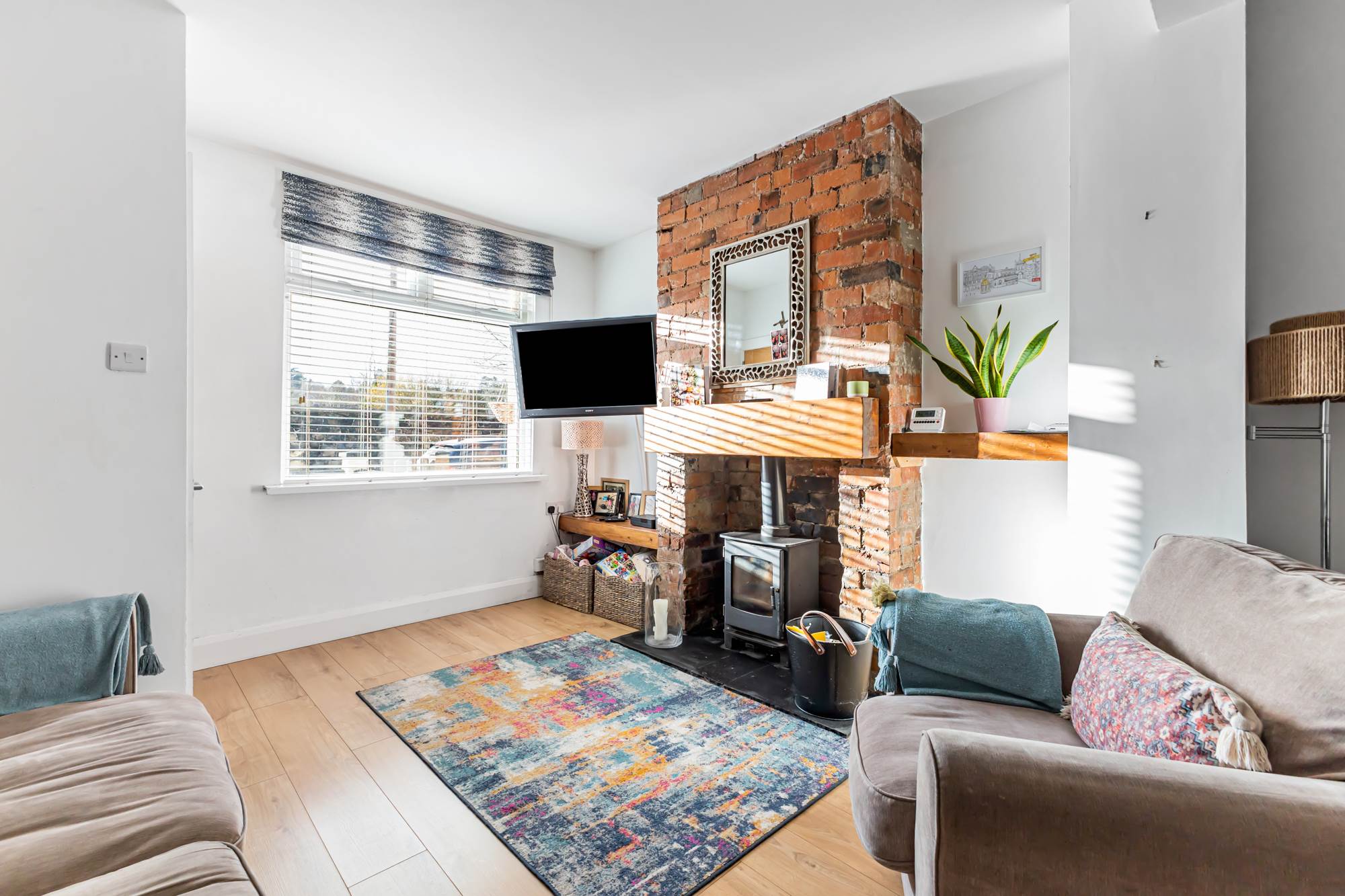 (at widest points). Cast iron fireplace with slate hearth and wood burning stove, laminate flooring.