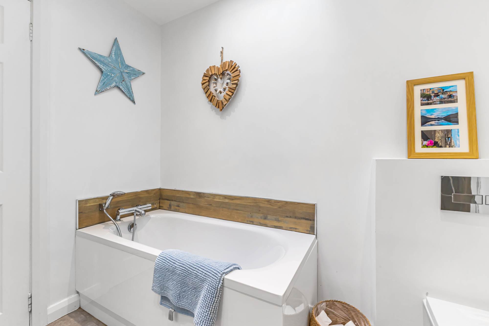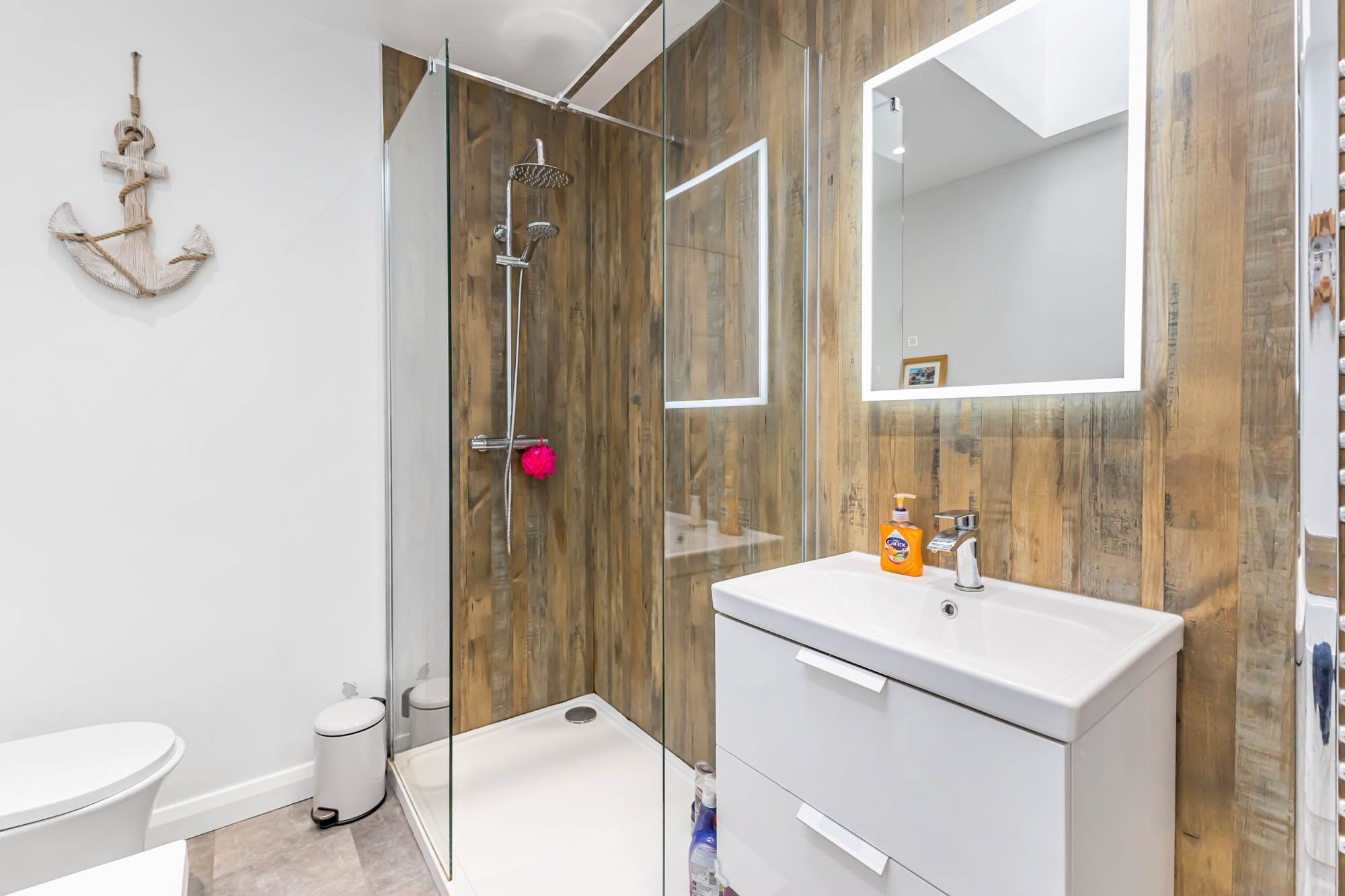 Recently installed modern panelled walls, shower and panelled bath with mixer taps, heated towel rail, vanity wash hand basin, low flush wc.