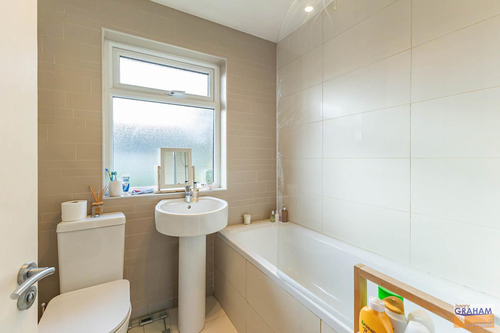 White suite. Tile enclosed bath with mixer tap and shower attachment. Mira electric shower. Pedestal wash hand basin with mono style mixer tap. Close couple low flush wc. Chrome finish heated towel rail. Part tiled walls. Tiled floor. Separate hotpress on landing.
