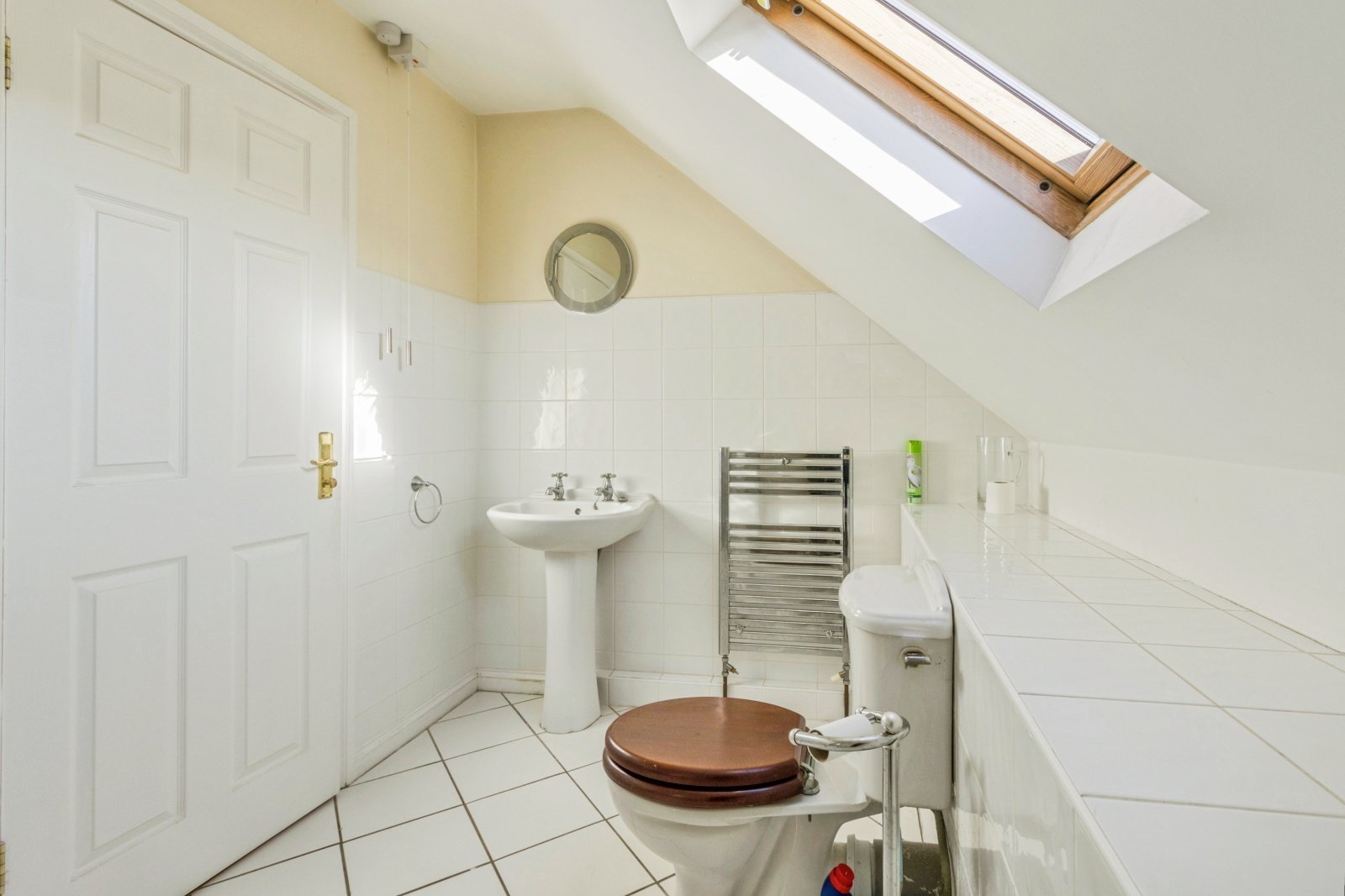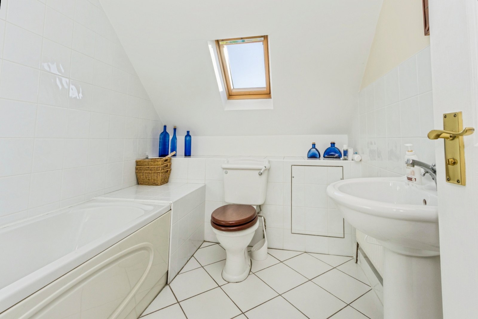 White suite comprising panelled bath, wash hand basin, low level WC, wall and floor tiling.
